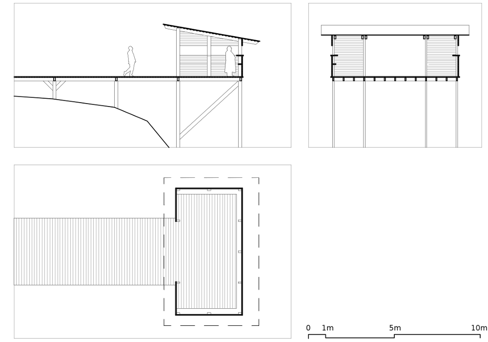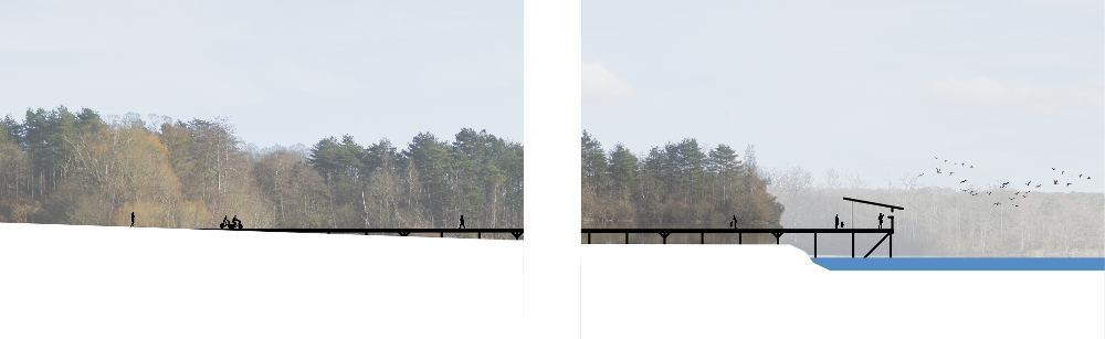 Le développement de l’écosystème marin cause une augmentation de la population des oiseaux. Cette évolution de la faune est prise comme une opportunité de développer l’observation ornithologique. Le problème dans ce secteur est l’accès aux bassins qui est régulièrement inondé et ne permet pas d’accéder aux meilleurs points de vue. La construction d’une série de dispositifs constitués d’une passerelle surélevée donnant accès à un observatoire ornithologique permet de profiter d’un cadre d’observation optimal. Cette passerelle se positionne dans le prolongement des chemins de randonnée de la forêt de Fontainebleau et est protégée des inondation du Loing jusqu’à 3m au dessus du niveau normal. Cette hauteur n’est dépassée que très rarement. Cet observatoire devient lors d’inondations importantes une opportunité d’observer ce phénomène naturel dans un environnement unique, au milieu de la forêt.