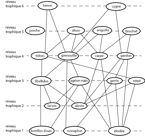 Un écosystème est un réseau d’acteurs biologiques interagissant entre eux. Ils développent des échanges d’énergie et de matière définissant ainsi une chaîne alimentaire. Cette chaîne est souvent représentée de manière linéaire, or on a plus affaire à des réseaux très complexes qui ont une forme de toile lorsqu’elle est représentée par les biologistes, on parle de réseau trophique. Plus la diversité biologique est importante, plus le maillage de ce réseau est dense et complexe. Un tel réseau est donc beaucoup plus solide lors d’une perturbation. Si une espèce disparaît même temporairement, une autre espèce du même niveau trophique peut occuper la niche biologique vacante et assurer la stabilité du système. Avec une faible biodiversité, les risques d’effondrement de l’écosystème sont plus importants car le réseau trophique présente un maillage très faible.
