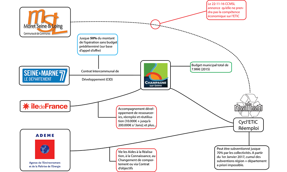 Quand au laboratoire de réemploi, il demande un investissement de départ pour son équipement en outillage et mobilier de travail. La Région Ile de France propose différentes aides concernant ce type d'activités, notamment un plan spécifique ressourceries et réemploi, un programme de soutien à l'urbanisme transitoire, ou encore un contrat de suvention pour les emplois d'insertion liés à l'environnement. Pendant cette première phase, les deux collectifs se constituent, et lancent leur activité jusqu'à la stabilité budgétaire. Notons que la phase de communication sur la crétaion des ateliers est un moment primordial pour assurer leur bon démarrage car les deux nécessitent une participation importante de bénévoles convaincus par l'économie collaborative convoquée ici.