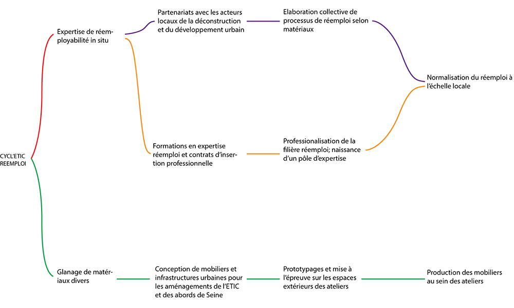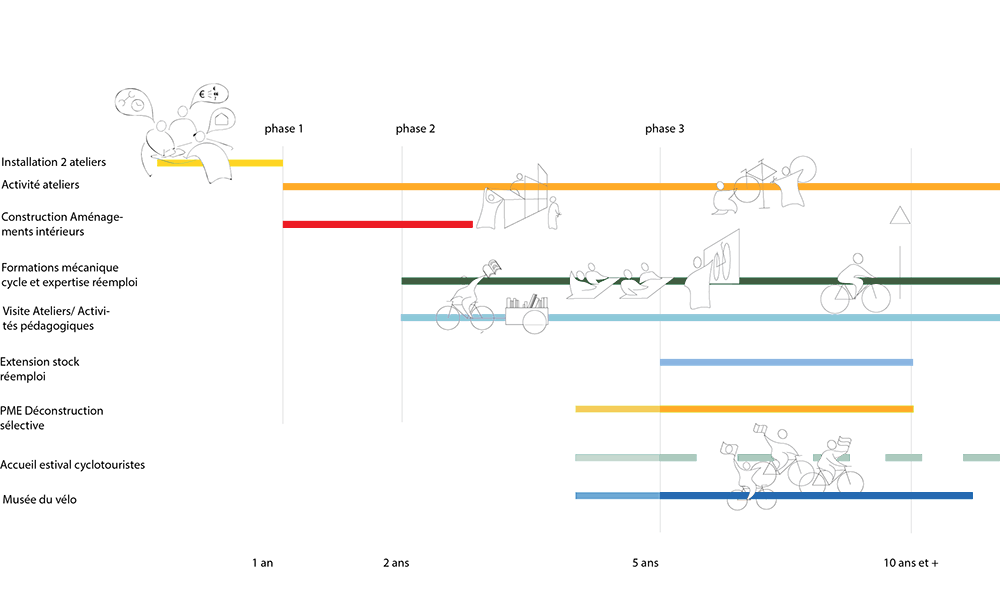 Parce que l'installation de Cycl'ETIC ne saurait être le résultat d'une réalisation unique habituelle d'un chantier de construction du fait de sa nature collaborative et de l'articulation de ses montages financiers, nous prévoyons un développement en trois phases. La première est celle de l'installation des ateliers associatifs dans les locaux communaux qui leur sont loués et le démarrage de leur activité. Vient ensuite une phase de construction des aménagements intérieurs qui permettent d'opérer de façon organisée dans des locaux confortables. Ces structures permettent alors de créer les formations, activités pédagogiques et activités annexes de chacunes (visites et expositions pour le réemploi, vélo-école, biblicyclette et aide à la personne en triporteur pour le vélo, par exemple). Ces deux phases nécessitent l'obtention d'un droit de passage sur le terrain de l'entreprise voisine afin que les ateliers de réemploi puissent opérer en autonomie. Un troisième temps serait celui de l'accroissement des activités Dans ce scénario, les associations ou la commune se portent acquéreuses des bâtiments voisins du côté des berges. Le terrain est alors occupé par le stock élargi des matériaux de réemploi glannés sur l'ETIC puis dans un rayon plus grand et l'exposition des prototypes de mobilier urbain et des infrastructures, tandis que les nouveaux bâtiments abritent une jeune PME spécialisée en déconstruction sélective qui possède les machines adaptées à cette activité et collabore aux chantiers des ateliers entre autres; un petit accueil hôtelier estival pour les cyclotouristes et enfin une cafétéria liée à une exposition permanente sur l'histoire du vélo.