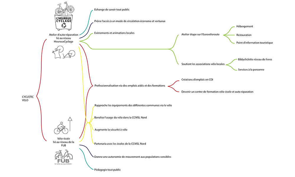 Les deux ateliers sont donc pensés comme vecteur de nouvelles actvités au service de la commune et de la communauté des citoyens. Ainsi les ateliers vélo donnent l'opportunité de professionnaliser les savoirs-faire acquis dans la pratique en ateliers via des compléments de formation certifiés au niveau national et délivrant un diplôme de technicien cycle, pour des débouchés ches les vélocystes et autres distributeurs de vélos en France. L'association l'Heureux Cyclage est un réseau d'ateliers participatifs de récupération et réparation de vélos qui aide à la propagation de ces savoirs-faire et promeut l'entraide au niveau horizontal entre les petites structures. Cette politique débouche donc sur des emplois en insertion puis en CDI. La production des ateliers les amène à promouvoir l'utilisation quotidienne du vélo également chez les plus jeunes. La création d'une vélo-école est donc l'une des suites logiques de leurs activités. En effet, l'utilisation du vélo pour la mobilité quotidienne vers son lieu de travail ou les divers institutions, commerces et points d'intérêts renforce les liens préexistants à l'échelle locale. Le vélo devient vecteur d'une nouvelle apréhension du petit territoire par les usagers, dont les ateliers sont un point de repère au même titre que les franchissements réaménagés sur la Seine et la signalétique dont le projet est porté par CCMSL et le département en ce moment-même.