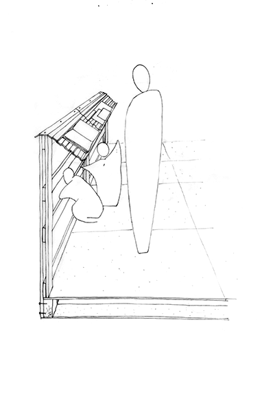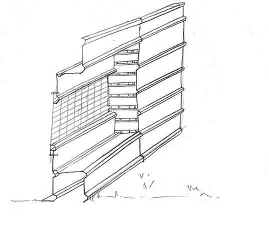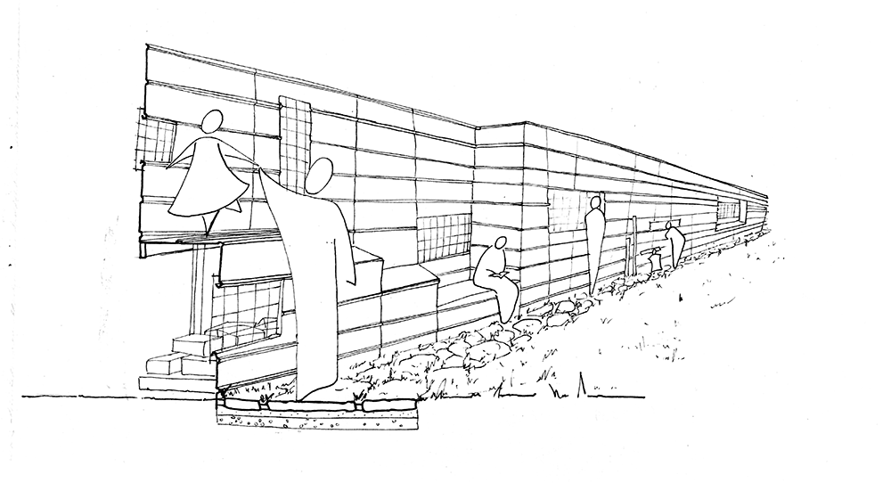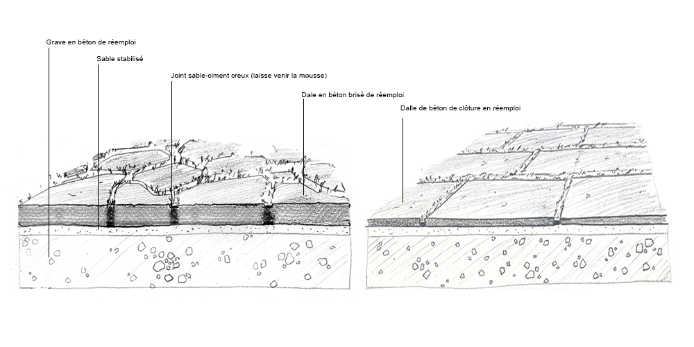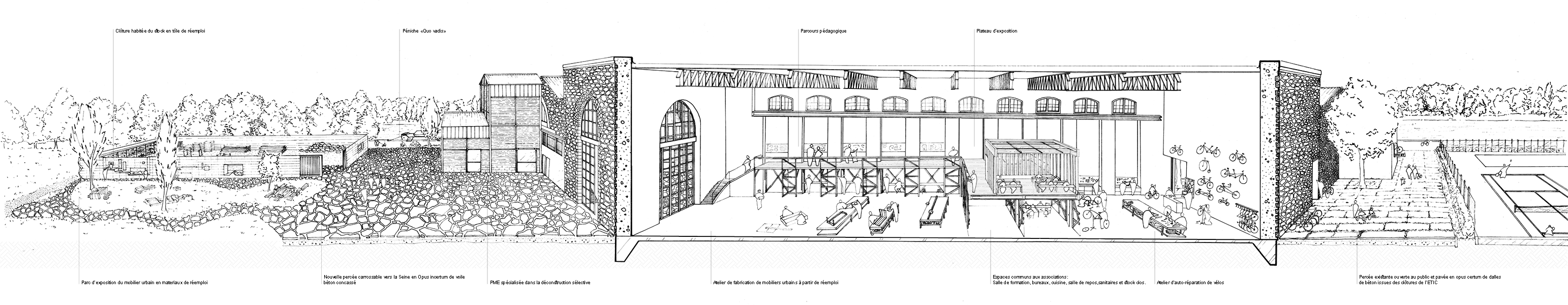 L'activité des ateliers de réemploi leur permet d'aménager leurs locaux et abords avec leurs productions. Nous présentons ici quelques exemples de réemploi appliqué à partir de matériaux glanés sur des bâtiments de l'ETIC repérés par Ana Carolina dans son étude: un opus certum en plaques de béton préfabriqué des clôtures d'enceintes de l'actuel bâtiment municipal, déconstruite dans notre projet; un opus incertum en pièces de béton irrégulières issues de la déconstruction de l'ancien poste électrique proche des ateliers, viennent assurer un sol roulant pour vélos d'un côté et machines de l'autre. La nouvelle clôture hâbitée du stock des matériaux est conçue à partir du bardage métallique du club "Le Kio", située dans la future zone renaturalisée de Champagne. Enfin le garde-corps de la paserelle de visite à l'intérieur des ateliers permet l'exposition de leurs productions graphiques et écrites à partir du même matériau et de petites sections de bois.