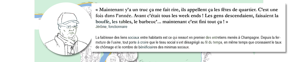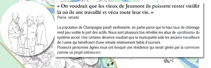 Champagne a la particularité de compter environ 30% de chômeurs dans sa population, ce qui peut être un atout sous forme de main d’oeuvre stimulable dans notre cas, notamment dans le cadre d’un projet de réemploi des matériaux issus d’une déconstruction sélective des bâtiments sous-utilisés non-patrimoniaux disséminés sur la zone (projet B2).