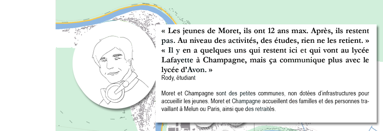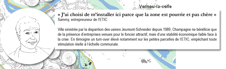 À l’échelle de la ville, on constate que l’ETIC crée une fracture dans le territoire, fragmentant spatialement les différents quartiers de Champagne et bloquant de possibles trames entre la ville et ses voisines Saint-Mammès et Veneux-les-Sablons.