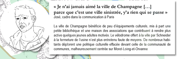 Les champenois souffrent d’une politique culturelle assez réduite ; quelques associations existent, les mêmes événements se répètent d'une année sur l'autre. Mais c’est surtout le lien social qui semble manquer aux habitants : sont toujours soulignées les différences de groupes sociaux dont l’action ou l’inaction nuirait aux autres, ainsi que le manque de communication de la municipalité sur ses actions.
