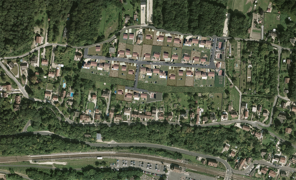 Champagne-sur-Seine est une ville qui perd des habitants depuis les années 90, elle ne constitue donc pas un secteur potentiellement rentable pour les promoteurs immobiliers, il est donc peu probable qu’une opération de promotion groupée ne voie le jour sur ce terrain. En revanche, un aménageur-lotisseur pourrait tout à fait s’y implanter. Le terrain, acheté à très bas coût aux divers propriétaires des parcelles naturelles, serait viabilisé (installation des réseaux d’eau, électricité, gaz), puis « loti », c’est-à-dire découpé en lots à bâtir desservis par une voirie nouvelle. L’aménageur-lotisseur réalise une marge sur le prix de revente de ces terrains, prêts à bâtir, par rapport à leur valeur d’origine. Le constructeur de maison individuelle vient ensuite proposer au futur habitant un projet « clé en main », et vend ainsi le terrain accompagné d’une maison. Ces maisons sont façonnées par un fonctionnement économique le plus efficace possible. Un recours à des matériaux génériques peu coûteux et rapides de mise en œuvre est requise. C’est | ainsi que bien souvent on trouve utilisé pour la maison individuelle un montage structurel en parpaings associé à une isolation extérieure en polystyrène expansé (avec les nouvelles normes de la RT 2012), recouvert ensuite d’un enduit en façade. Une charpente en fermette vient couvrir le tout. Ce mode de production pose la question d’une perte des savoirs faires constructifs locaux, de l’énergie grise utilisée (énergie requise pour produire ces matériaux), mais aussi du peu d’efficacité thermique d’un pavillon isolé au milieu d’une parcelle. Cet urbanisme soulève l'enjeu d’économie des terrains dans un contexte d’étalement urbain et de raréfaction des zones agricoles françaises.L’image suivante met en image ce « scénario zéro », destin probable des Poiriers si aucune volonté municipale n’est affirmée. Afin de desservir chaque parcelle, des voiries supplémentaires sont créées (donc plus d’excavation et d’imperméabilisation des sols, qui entrainent des problématiques d’écoulement des eaux de pluie, et à terme des rétentions d’eau). |