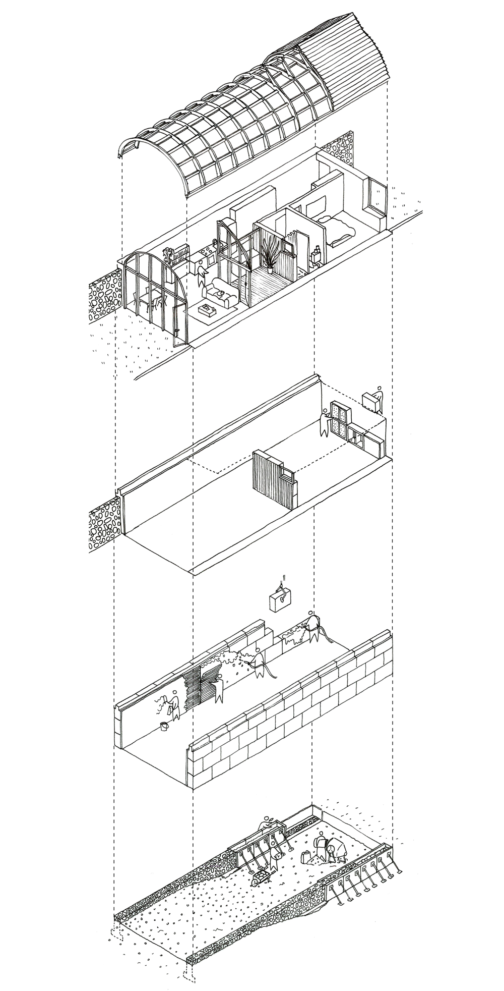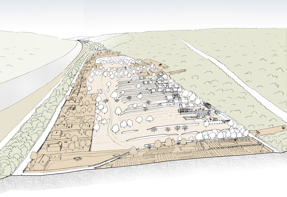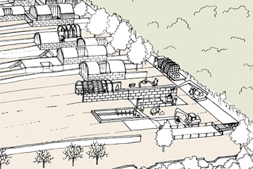 réseaux souterrains mais aussi pourfaciliter la logistique du chantier. Sur le principe des anciens murs viticoles, des murs mitoyens en pierre de taille issue de la carrière de calcaire de Château Landon seraient édifiés entre chaque parcelle, permettant l’inscription future des maisons. Ces murs, considérés comme un investissement, seraient construits et financés par les pouvoirs publics. L’aternance de l’avancement des maisons découle d’un soucis de préservation du site naturel (préservation des arbres existants). |