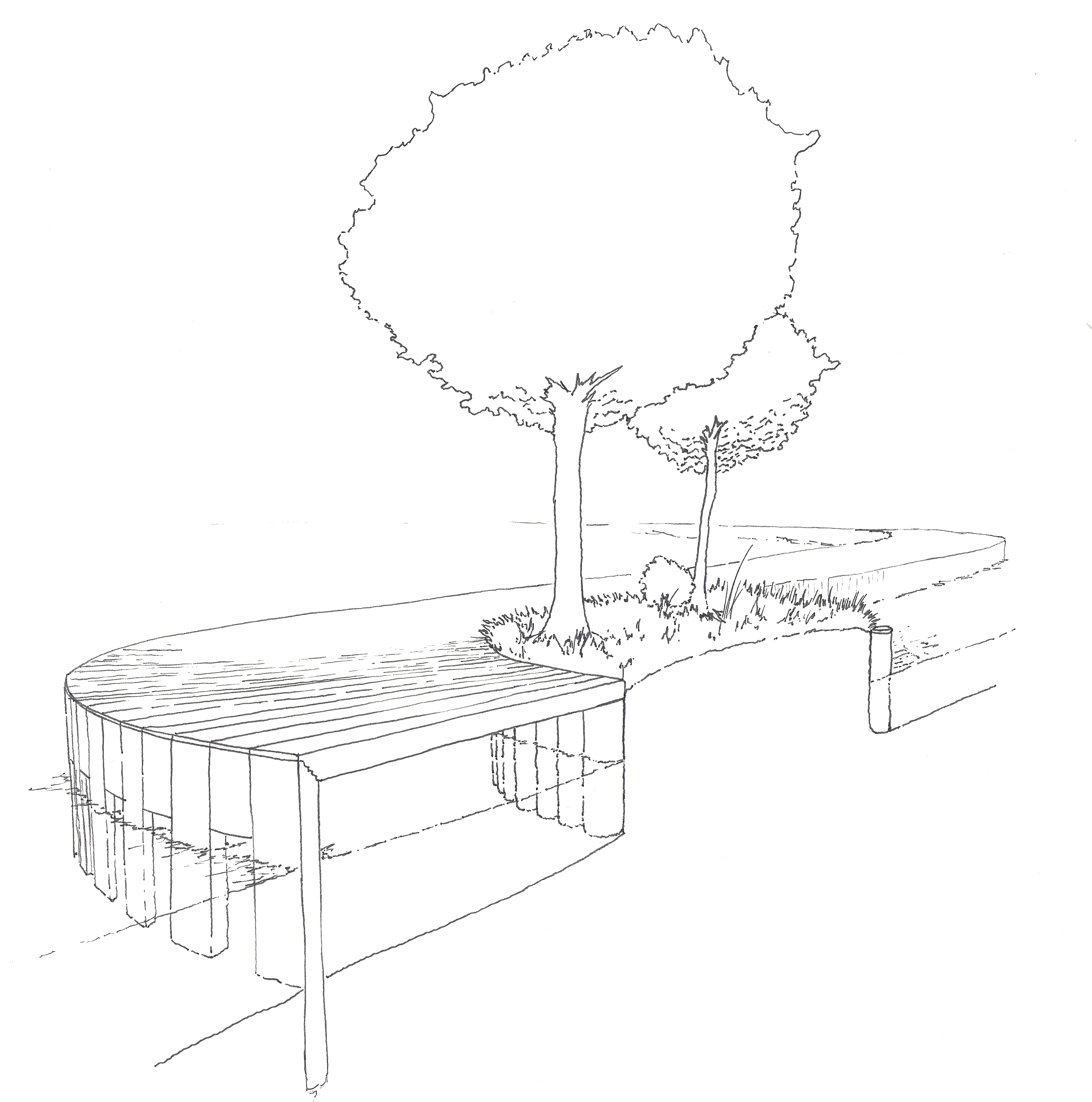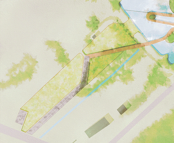 Mais le projet a aussi une dimension paysagère. Connectant les chemins qui descendent la vallée à la rue située en contrebas et reprenant l’idée du parcours sinueux d’une rivière, un ponton en bois de chataîgner se développe sur l’eau, reliant les îlots de l’étang dans une promenade architecturale. Le ponton se compose uniquement d’éléments en bois massif assemblés en portiques soit par des vis en métal soit par des tiges qui solidarisent le tout. Comme les pieux des digues, les pilotis sont également enfoncés dans le sol jusqu’à une profondeur d’1,50m, ce qui assure le contreventement des portiques. Le dessin du parcours implique que chaque élément du ponton doit être unique...