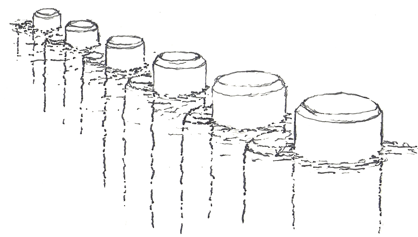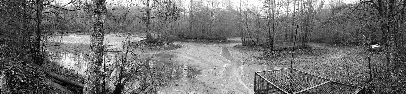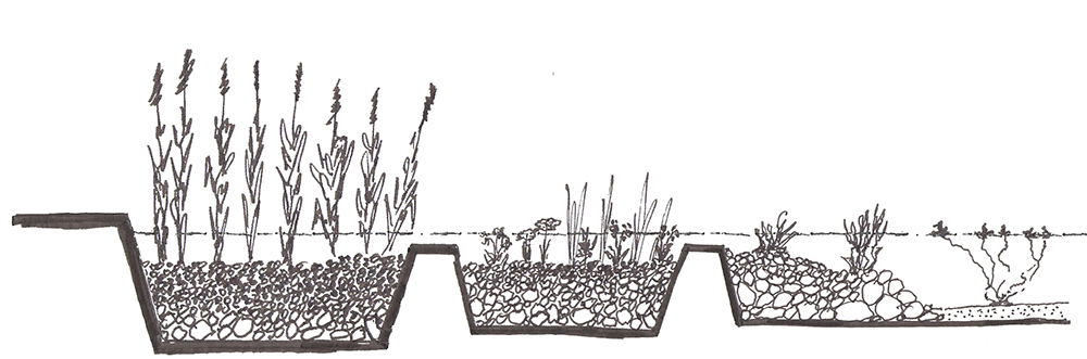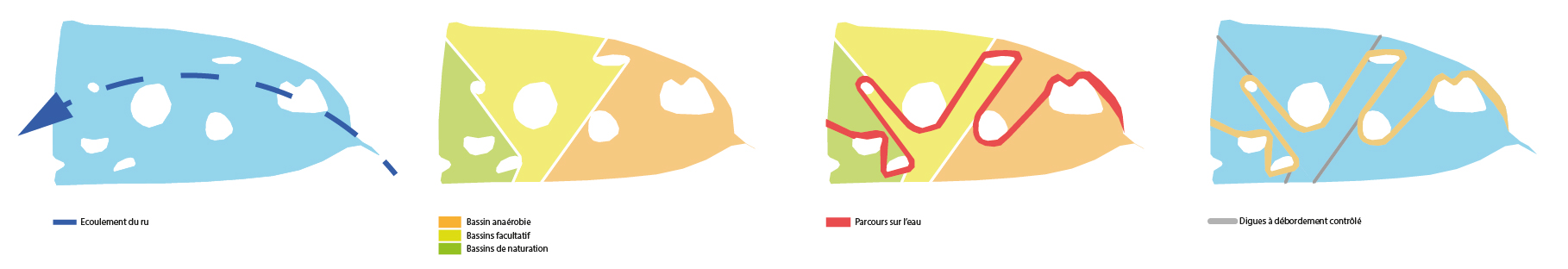 Il s’agit d’abord de créer des bassins de lagunage permettant de traiter naturellement l’eau des ruissellements des pesticides et engrais utilisés par l’activité agricole. L’étang est subdivisé en trois bassins : le bassin anaérobie, le bassin intermédiaire et le bassin de maturation, ils sont séparés par des digues en rondins de bois enchâssés dans le sol et disposés en merlons et créneaux permettant un débordement contrôlé d’un bassin à l’autre. De plus, ces rondins encerclent également les îlots, jouant le rôle de soutènement afin d’éviter l’affaissement de la masse de terre au contact de l’eau, la topologie de l’étang, ses reliefs et sa végétation se trouvent alors figés dans le temps par l’intervention. De plus, l’activité macro-biologique des bassins produit une boue devant être retirée régulièrement, environs tous les ans, et pouvant servir d’engrais naturel pour l’activité agricole.