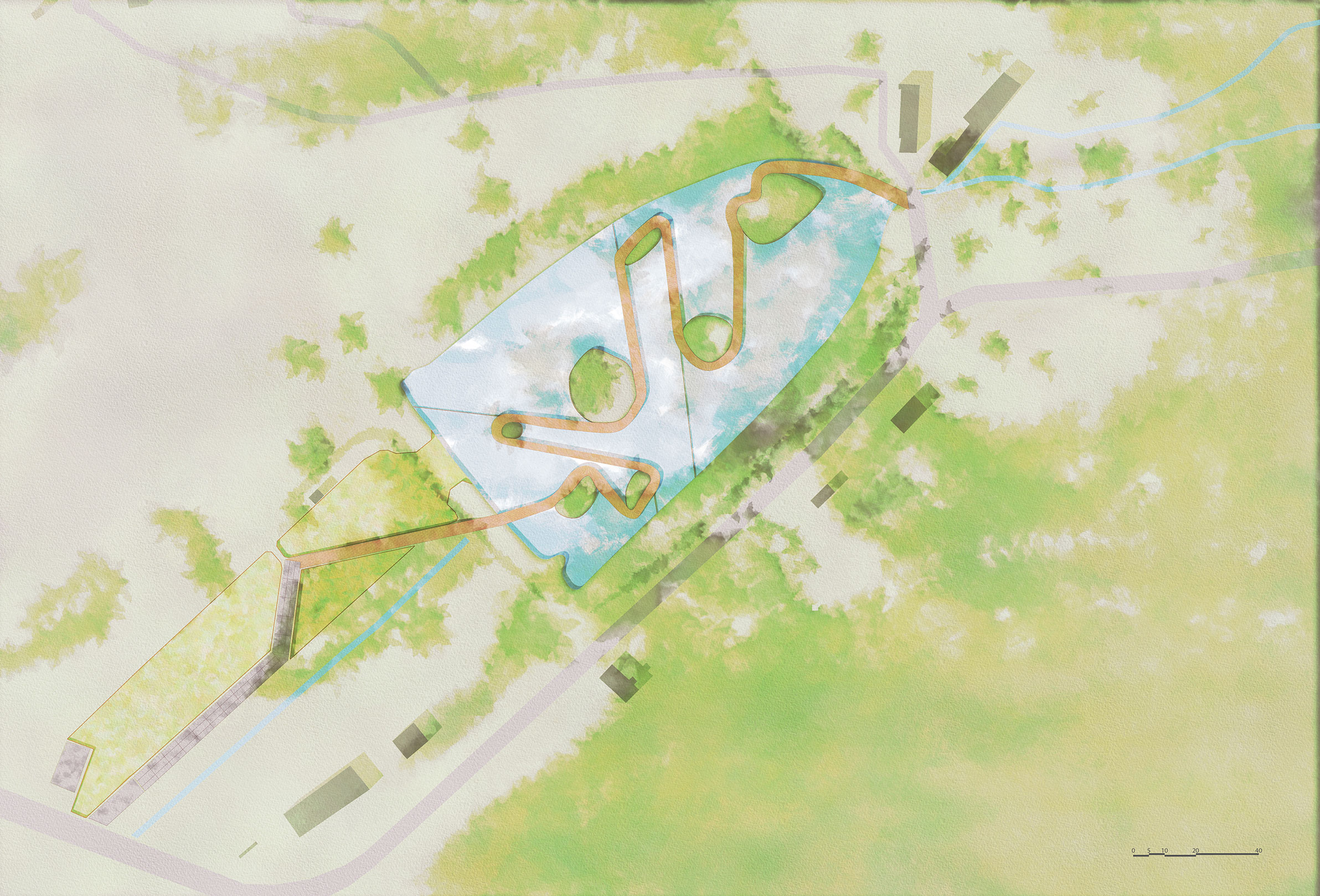 Le Méandre sur l’Eau est un projet qui se situe dans un territoire portant les cicatrices d’un passé industriel, la commune de Vernou-la-celle, dans la vallée des cinq moulins. La topographie locale est favorable à une concentration de pesticides car c’est le point de confluence des écoulements au sein du même vallon. Un bassin artificiel termine la course de la rivière, sa fonction était de fournir de l’eau de refroidissement pour une ancienne centrale à charbon dont les vestiges sont encore présents sur le site (empreintes des bâtiments annexes, locaux administratifs, cantines etc.). La topographie implique également des risques d'inondations lors de fortes crues de la rivière qui atteint les habitations proches. Le site fait une transition entre un environnement naturel rural quasiment intact en amont de l’étang et la zone industrielle située au bord de seine comptant entre autres la centrale à gaz. Le projet possède trois points majeurs, celui de dépolluer l’eau des ruissellements pour la redirigée vers un réseau utilitaire (et non sanitaire), de canaliser l'eau des crues dans des bassins annexes, évitant les inondations et de proposer un aménagement paysager permettant, dans un geste de renaturation, de valoriser une richesse environnementale et touristique.