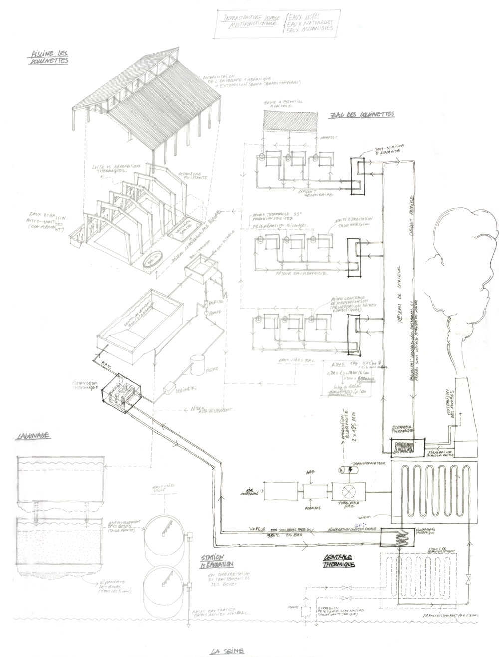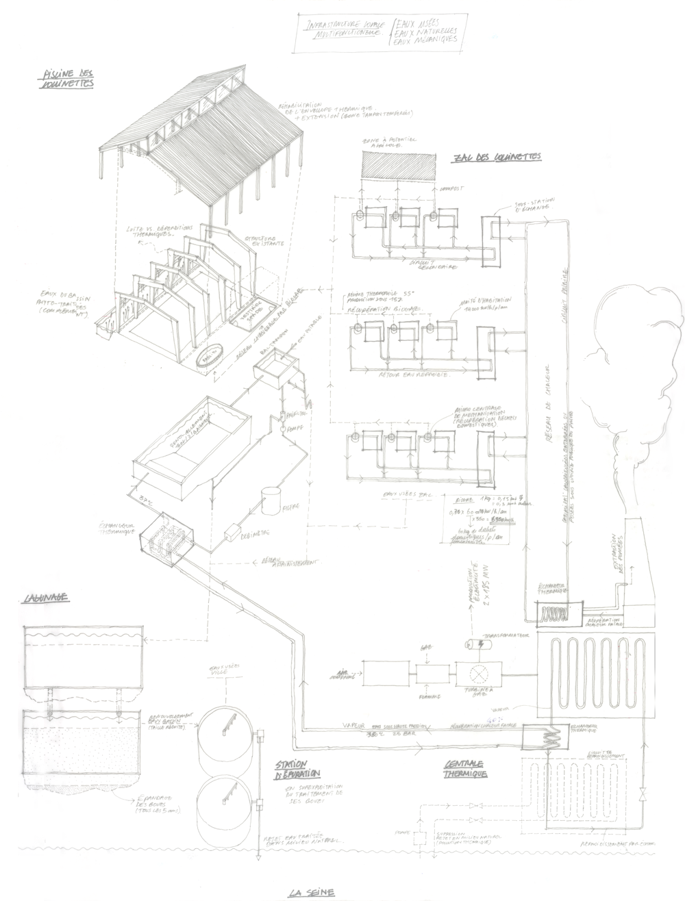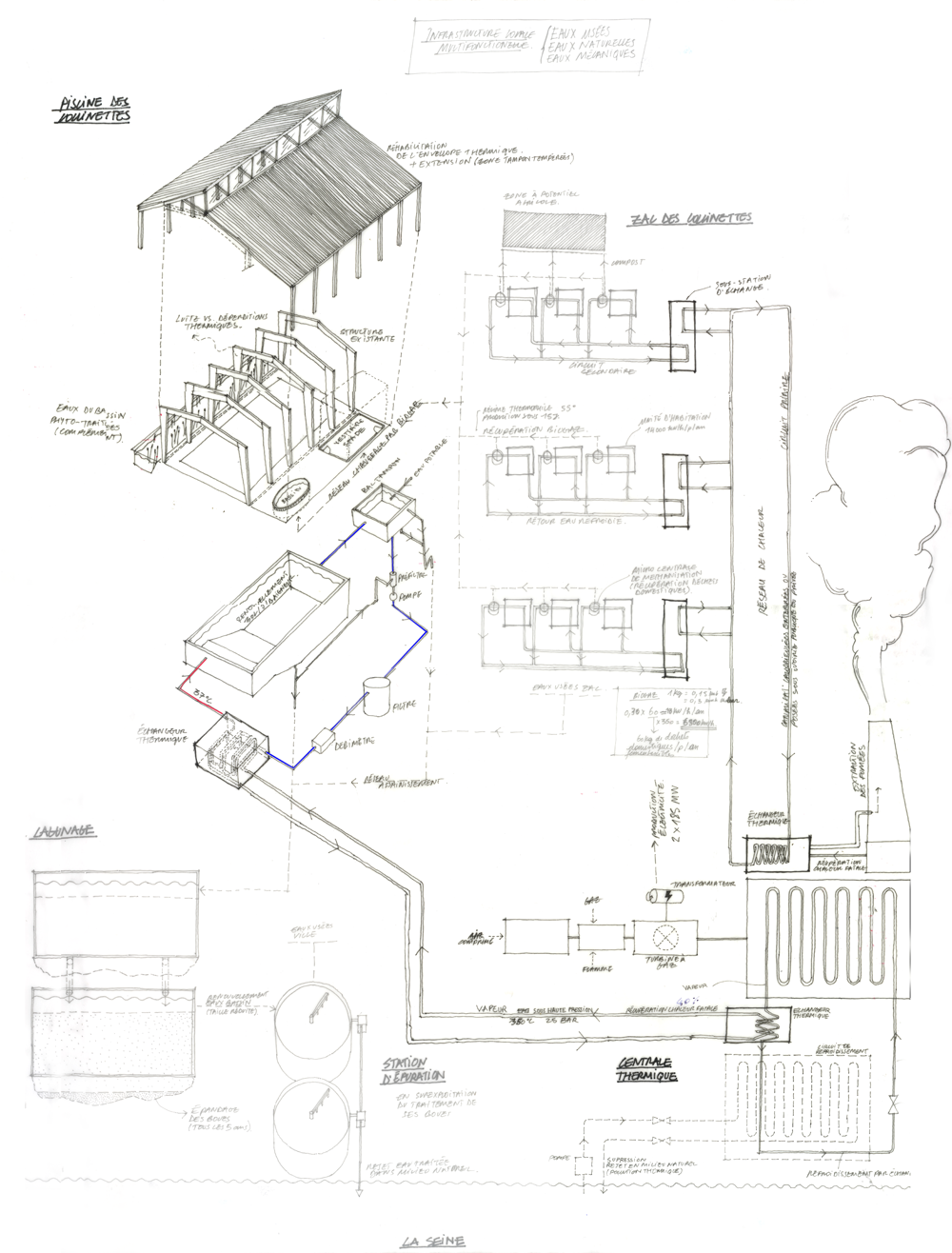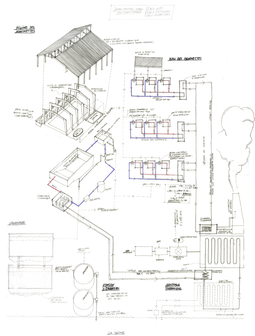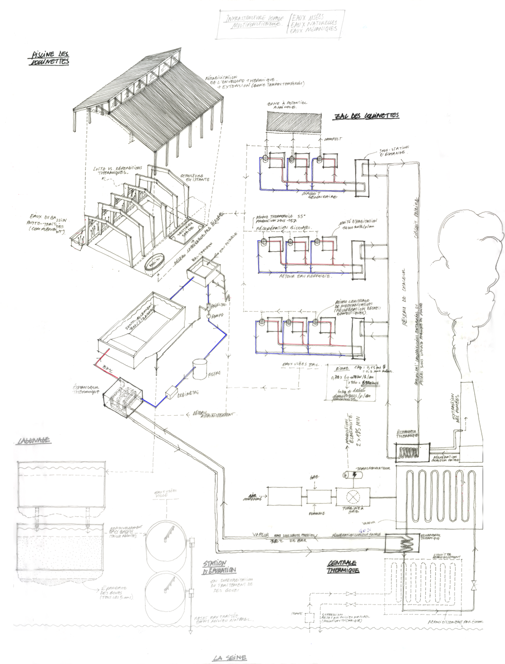 Dans le scénario proposé, la piscine viendrait se connecter au nouveau réseau primaire de cogénération. Le passage et la construction de ces nouveaux réseaux occasionnera la création d'un talus : positionné le long des terrains de football, les talus seront aménagés pour reconnecter le parc sportif au solarium de la piscine. La piscine se dote ainsi de deux nouvelles « épaisseurs » thermiques de part et d'autre. La première, qui donne sur le solarium, abrite les nouvelles installations ( vestiaires, cabines de douches), la deuxième abrite un bassin de phyto-traitement, qui s'ouvre selon les saisons. La nouvelle enveloppe de la piscine améliore les « apports passifs » thermique et particpe donc ainsi à réduire la consommation de chauffage. L'eau du bassin est désormais chauffée par l'énergie de co-génération, son traitement plus durable limite également le recours à des produits chimiques et favorise son assainissement dans les bassins de lagunage.