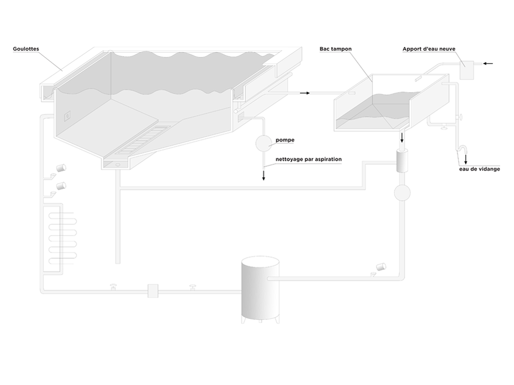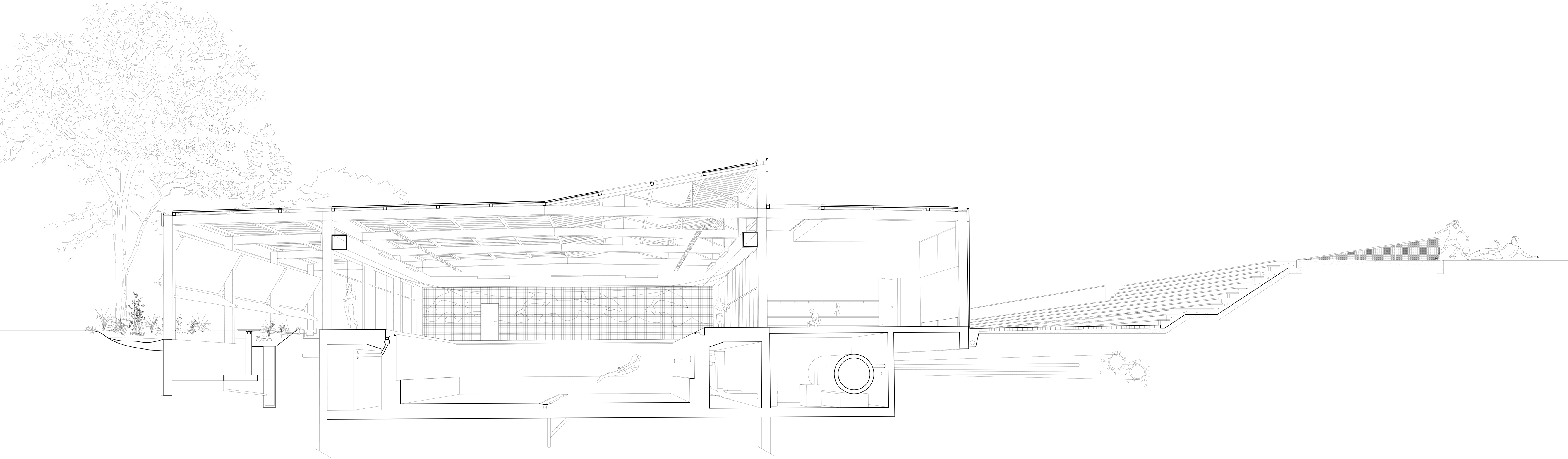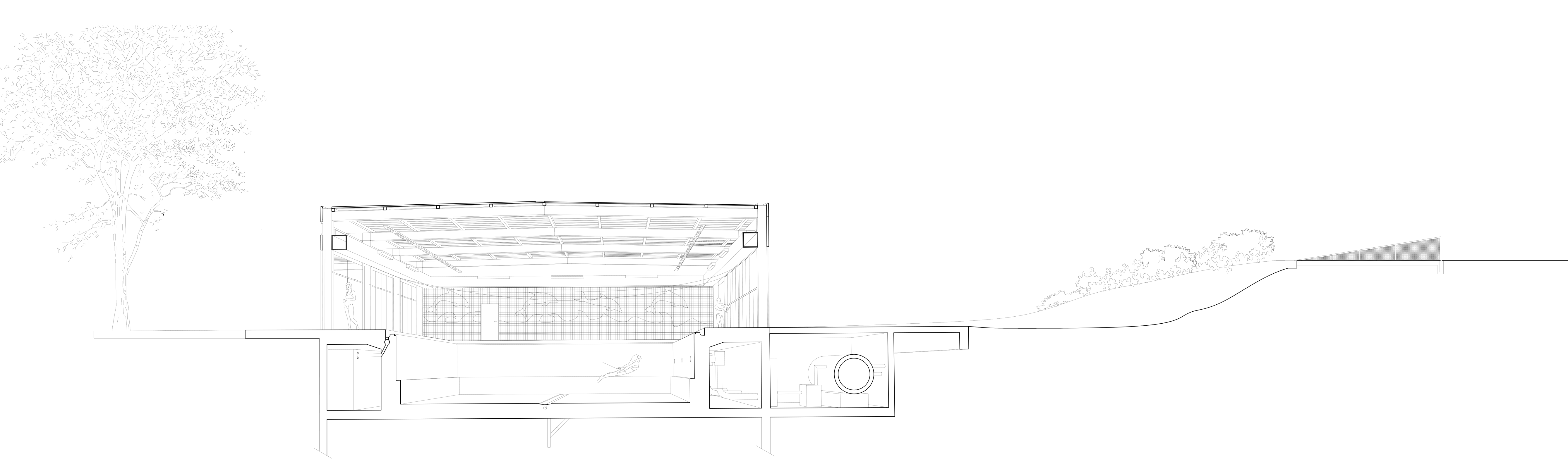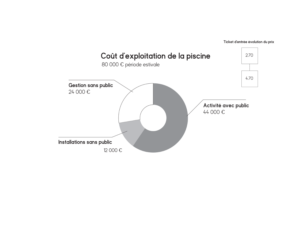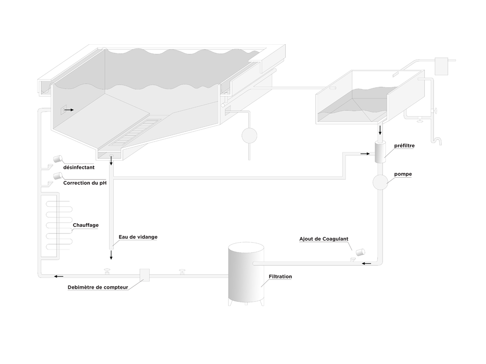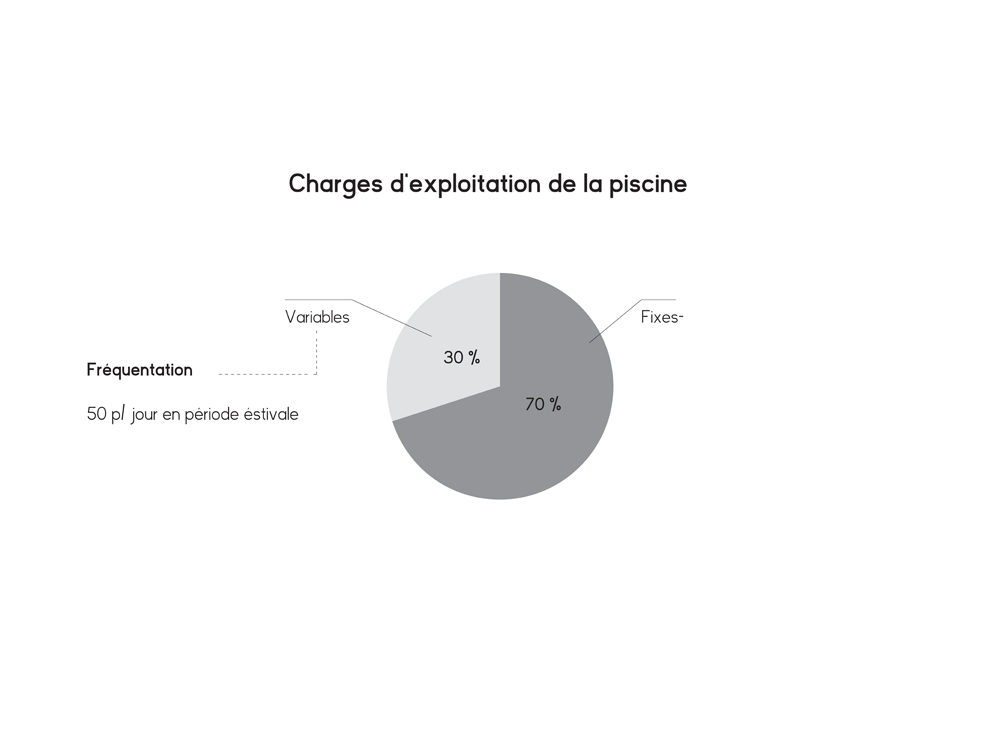 Dans le scénario proposé, la piscine viendrait se connecter au nouveau réseau primaire de cogénération. Le passage et la construction de ces nouveaux réseaux occasionnera la création d'un talus : positionné le long des terrains de football, les talus seront aménagés pour reconnecter le parc sportif au solarium de la piscine. La piscine se dote ainsi de deux nouvelles « épaisseurs » thermiques de part et d'autre. La première, qui donne sur le solarium, abrite les nouvelles installations ( vestiaires, cabines de douches), la deuxième abrite un bassin de phyto-traitement, qui s'ouvre selon les saisons. La nouvelle enveloppe de la piscine améliore les « apports passifs » thermique et particpe donc ainsi à réduire la consommation de chauffage. L'eau du bassin est désormais chauffée par l'énergie de co-génération, son traitement plus durable limite également le recours à des produits chimiques et favorise son assainissement dans les bassins de lagunage.