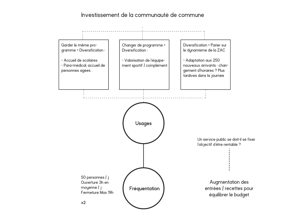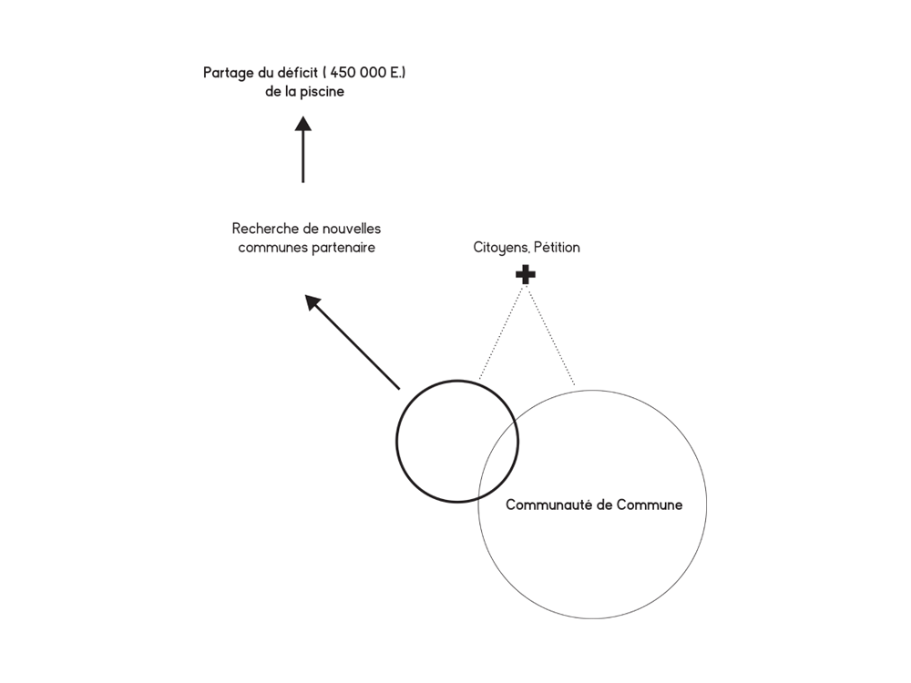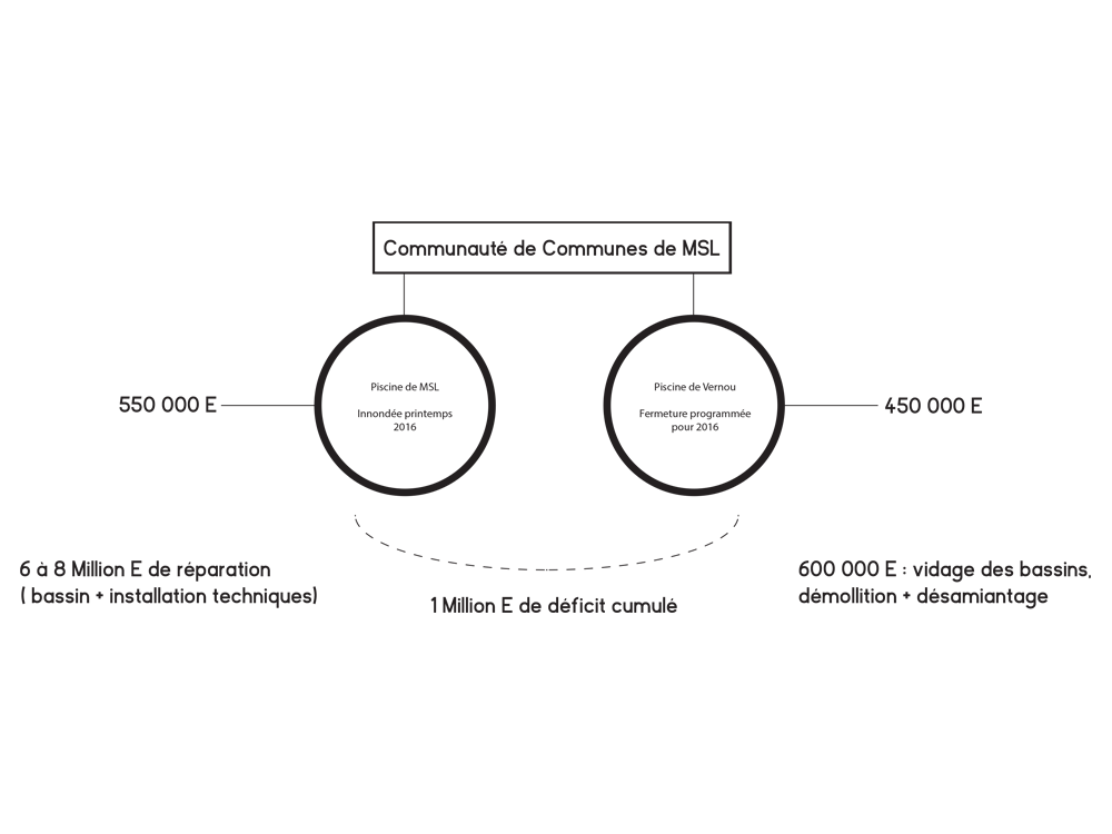 La piscine a subi une série de fermeture ponctuelles depuis 2013. L’inondation soudaine de la piscine de Moret-Sur-Loing au printemps 2016 a remis en cause la fermeture estivale programmée de la piscine de Vernou. Les deux piscines occasionnent à la CCMSL un déficit cumulé d’un million d’euros, à quoi s’ajoutent entre 6 et 8 millions d’euros de réparation pour la piscine de Moret. La démolition de la piscine des Colinettes se chiffre quant à lui à 600 000 euros. Une pétition lancée par les habitants de Vernou demande vouloir « éviter la fermeture d’un service public de proximité » afin de « continuer à accompagner la population dans son adaptation au milieu aquatique particulièrement prégnant dans notre environnement géographique». Le travail a consisté à mettre en oeuvre différents scénarios, transversaux ou non, permettant d’éviter sa fermeture. Ainsi pourrait être jouée une carte « politique » afin d’infléchir la position de la CCMSL, et recueillir de nouveaux financements. Une carte « programmatique » pour diversifier l’accès à la piscine et augmenter sa fréquentation : intégration dans le parc sportif existant, variation des horaires, anticipation de la venue des habitants de la ZAC etc. Une carte « énergétique » : développer un système de co-génération, afin de récupérer l’énergie perdue de la centrale thermique de Montereau, ou encore imaginer un branchement avec le canal de la Voulzie pour réduire les coûts de la piscine. Une carte « architecturale » pour agir sur « la machine en elle-même » en repensant les aménagements de la piscine et réduire ainsi ses coûts fixes : isolation, système d’épuration, déshumidificateur etc.
