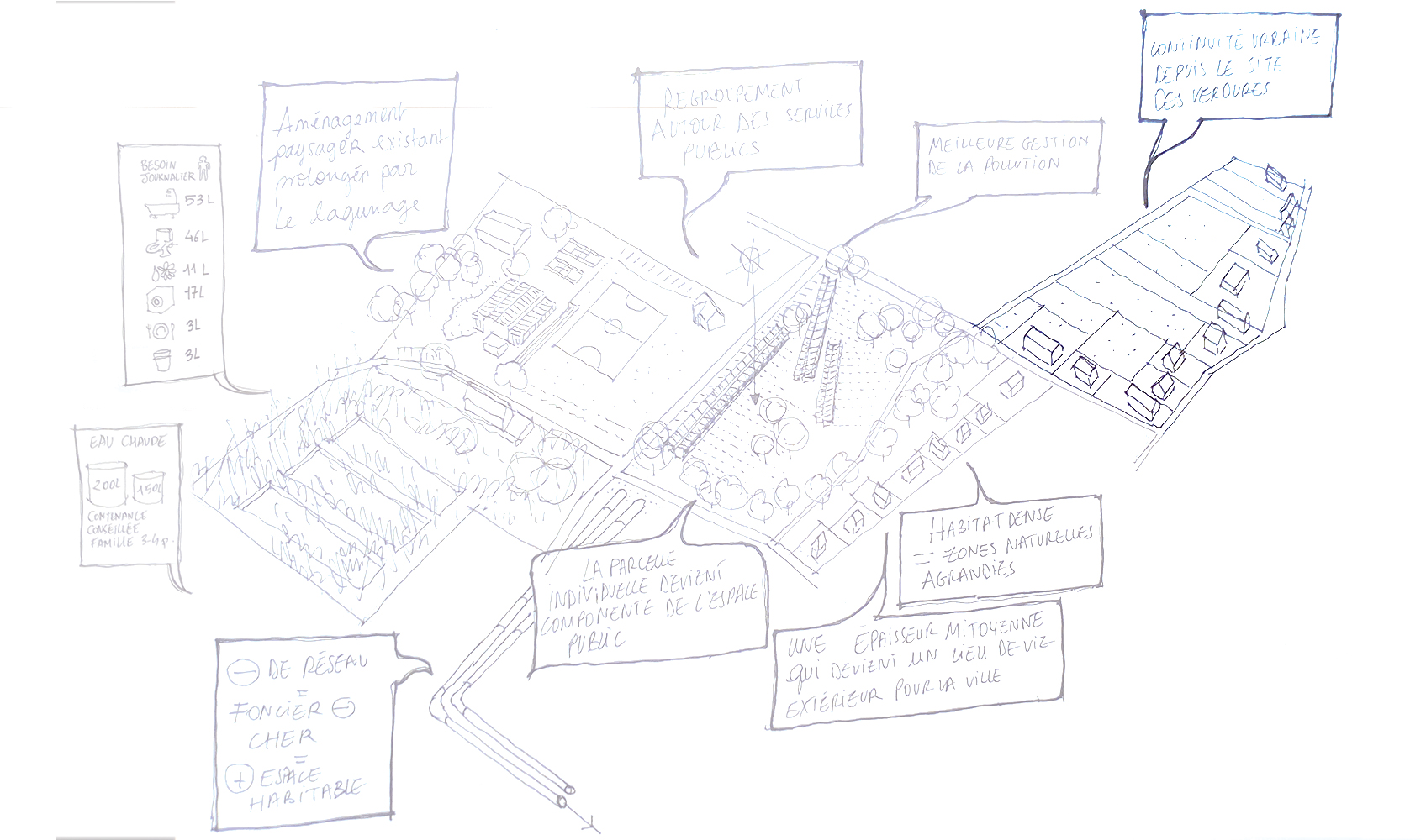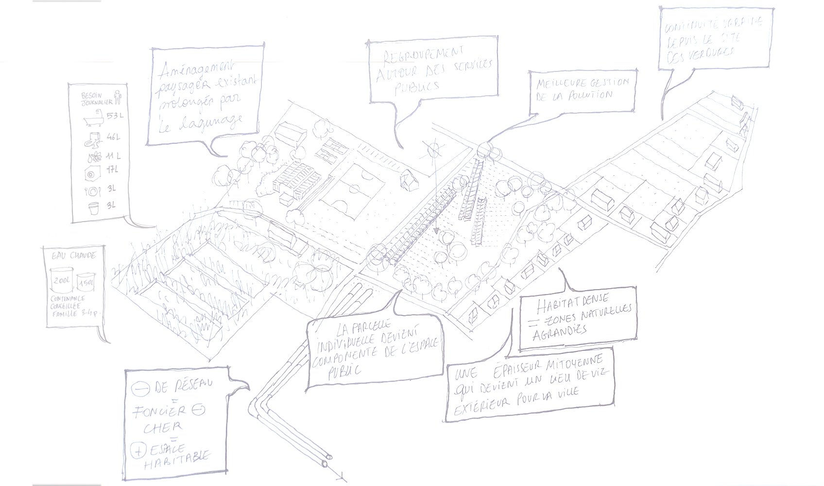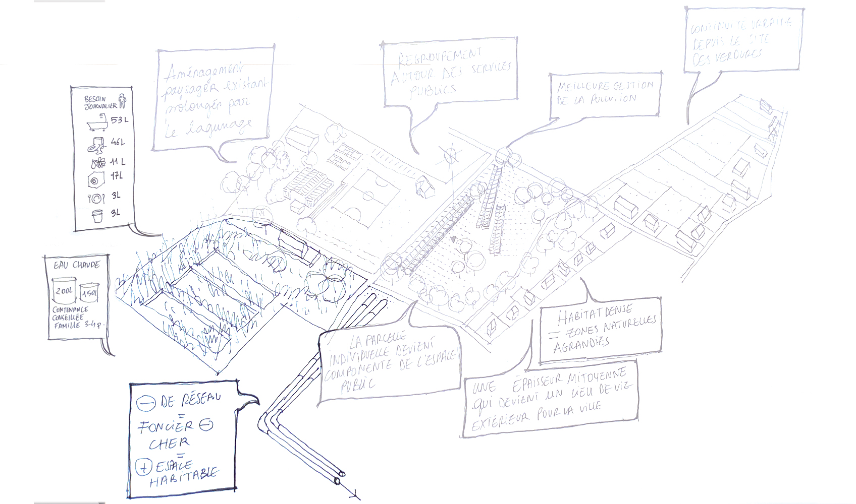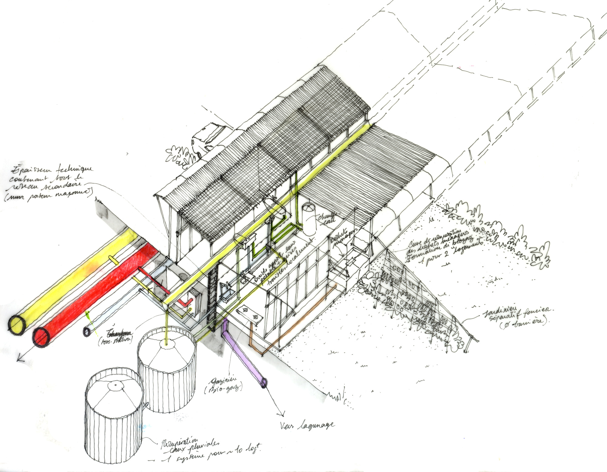 La mise en situation des réseaux d'energie constitue le cœur de la proposition d'implantation des logements. La densification du passage des reseaux influence directement l'orientation et la disposition des logements collectifs en bandes : connectés au réseau primaire d'energie de la co-génération, l'enfilade suit le chemin des reseaux. Ainsi chaque groupe de logement dispose d'une station d'échange ( échangeur), et d'un système de traitement des eaux communes. L'épaisseur des réseaux divise le logement en deux partie : le mur contient ainsi le reseau d'eau potable, l'assainissement, le chauffage et la redistribution des eaux grises. En plus d'un objectif de périnnité, les gains sont multiples : consommation d'eau réduite, chauffage réduit grâce à la cogénération et les apports passifs ( orientation et ventilation). La mise en œuvre constructive des réseaux est également simplifiée : les tranchées crées sont autant de talus sur lesquels viennent s'appuyer les différents logements qui se déroulent dans la pente du terrain. Les gains éspérés sur la facture énergétique et la densification des logements autours des réseaux seraient autant de gains sur le foncier : les parcelles offrent aux potentiels acheteurs ou locataires d'avantage de terrains en fond de parcelle, à l'image de l'organisation des « verdures ». Chaque terrain profite des décalages de la pente pour se diviser, cependant là encore certains usages peuvent être communs : gestion du bio-gaz par le compost, chemin d'accès, fond de jardin partagés qui deviennent du même coup des composants de l'espaces public. L'impact sur le paysage serait également moindre et d'avantage pensé en amont : la ZAC s'inscrit dans la continuité et en connection directe avec le parc sportif dont elle partage le réseau de chauffage. On peut également imaginer cette inter-dépendance comme constitutive de d'avantage de lien social : « mon voisin nage dans une piscine dont l'eau est chauffée par le même réseau qui chauffe l'eau de mon évier ». Là encore, des solutions de regroupement économique peuvent se mettre en place entre la gestion de la piscine municipale, et la mise à disposition du foncier pour la ZAC.
