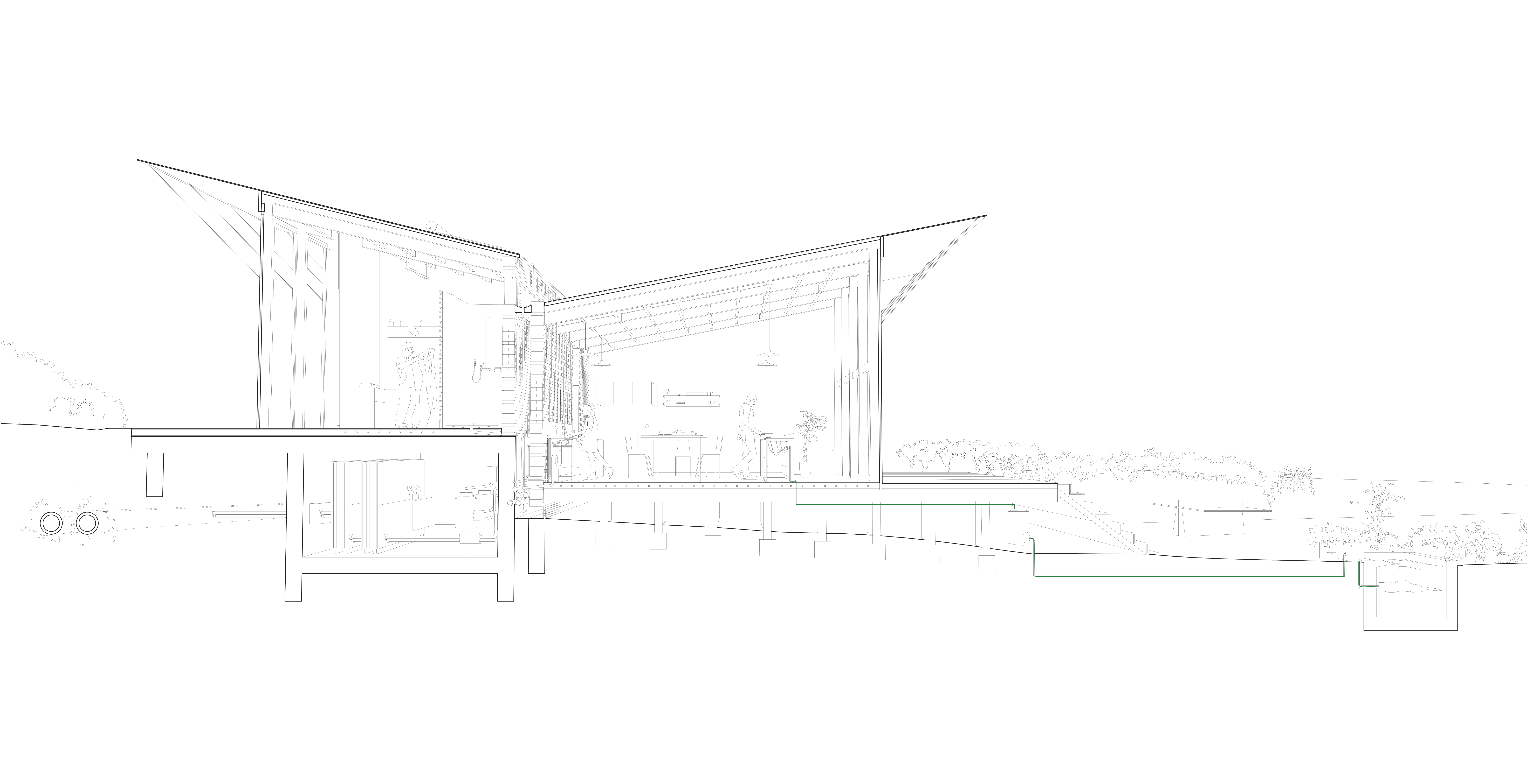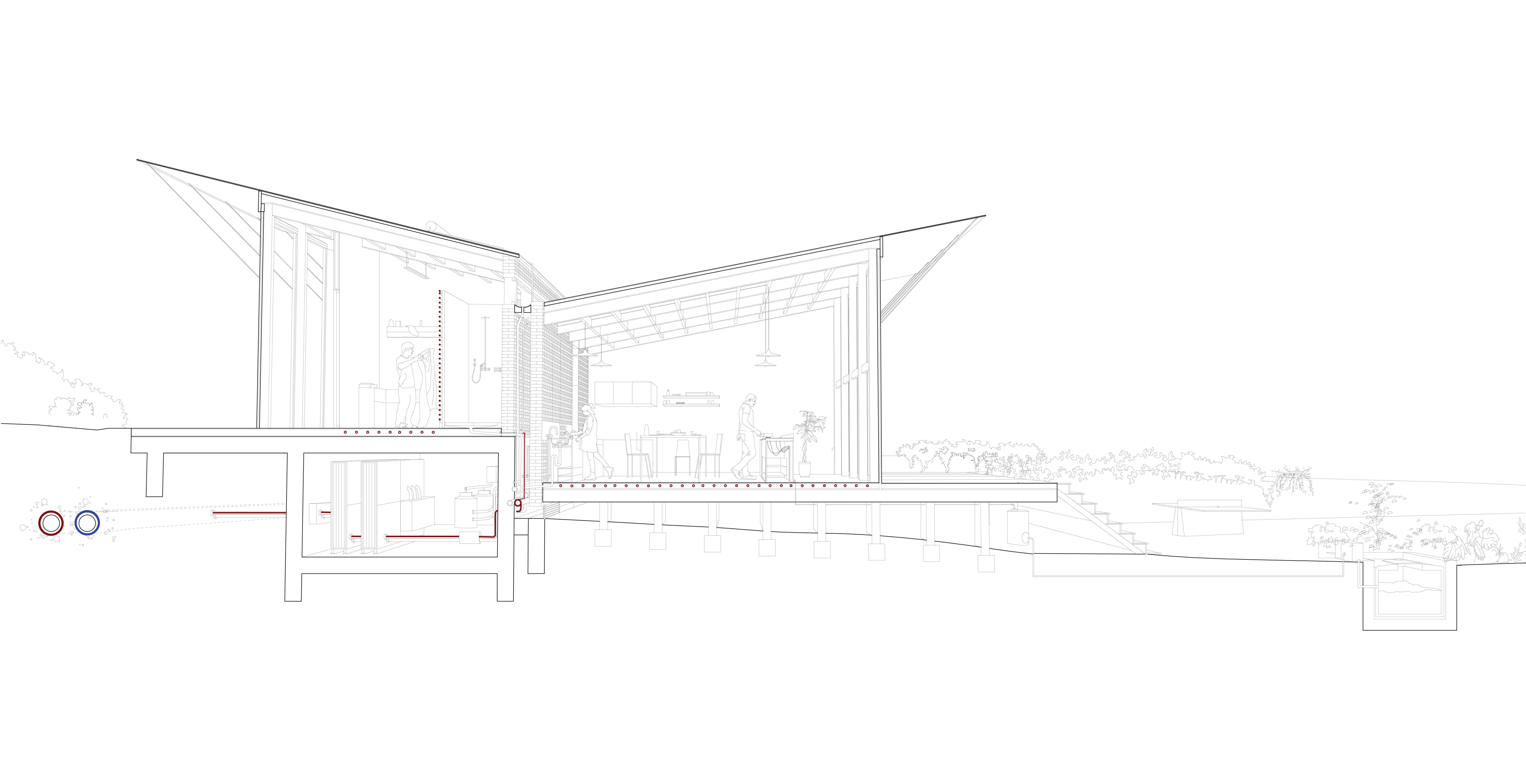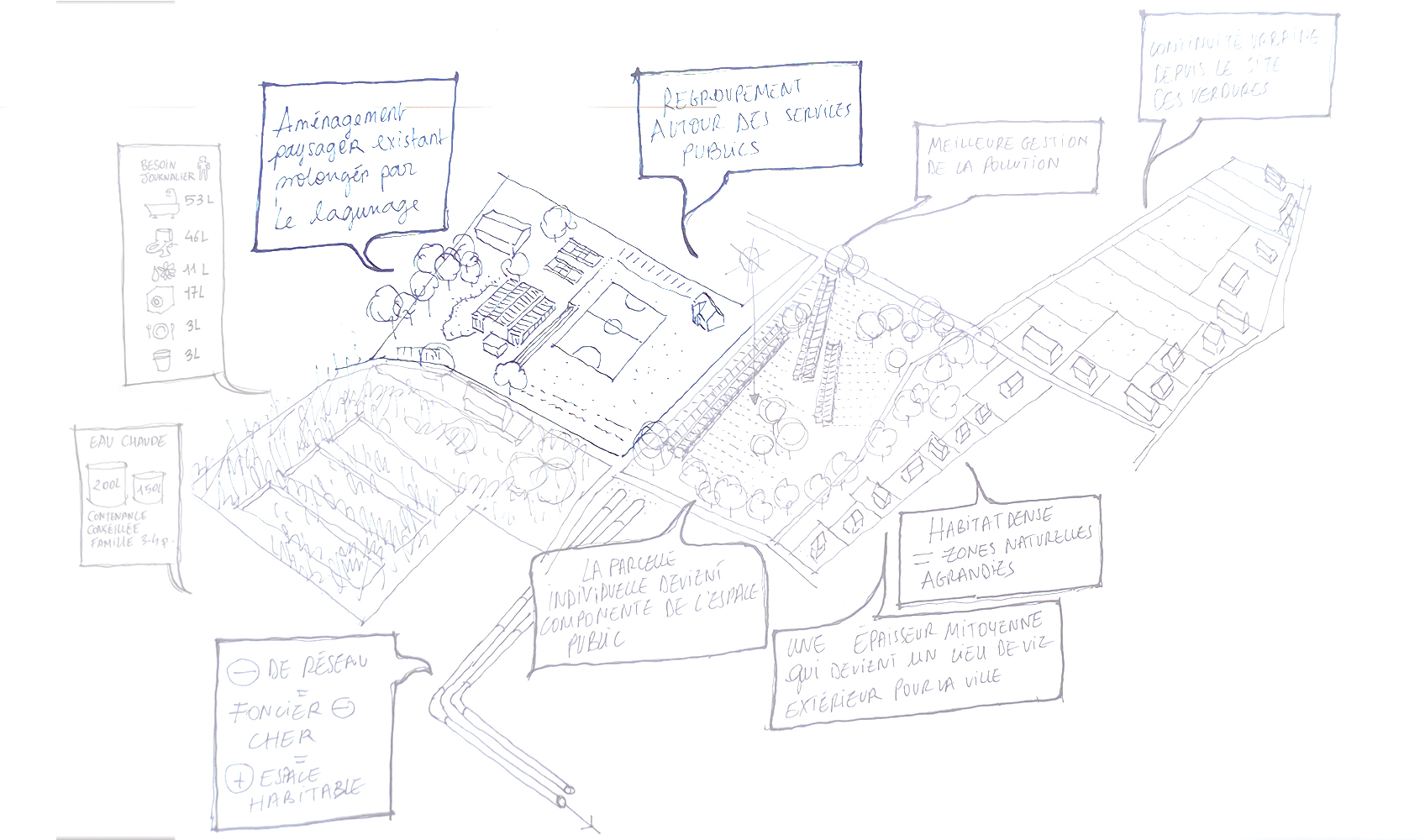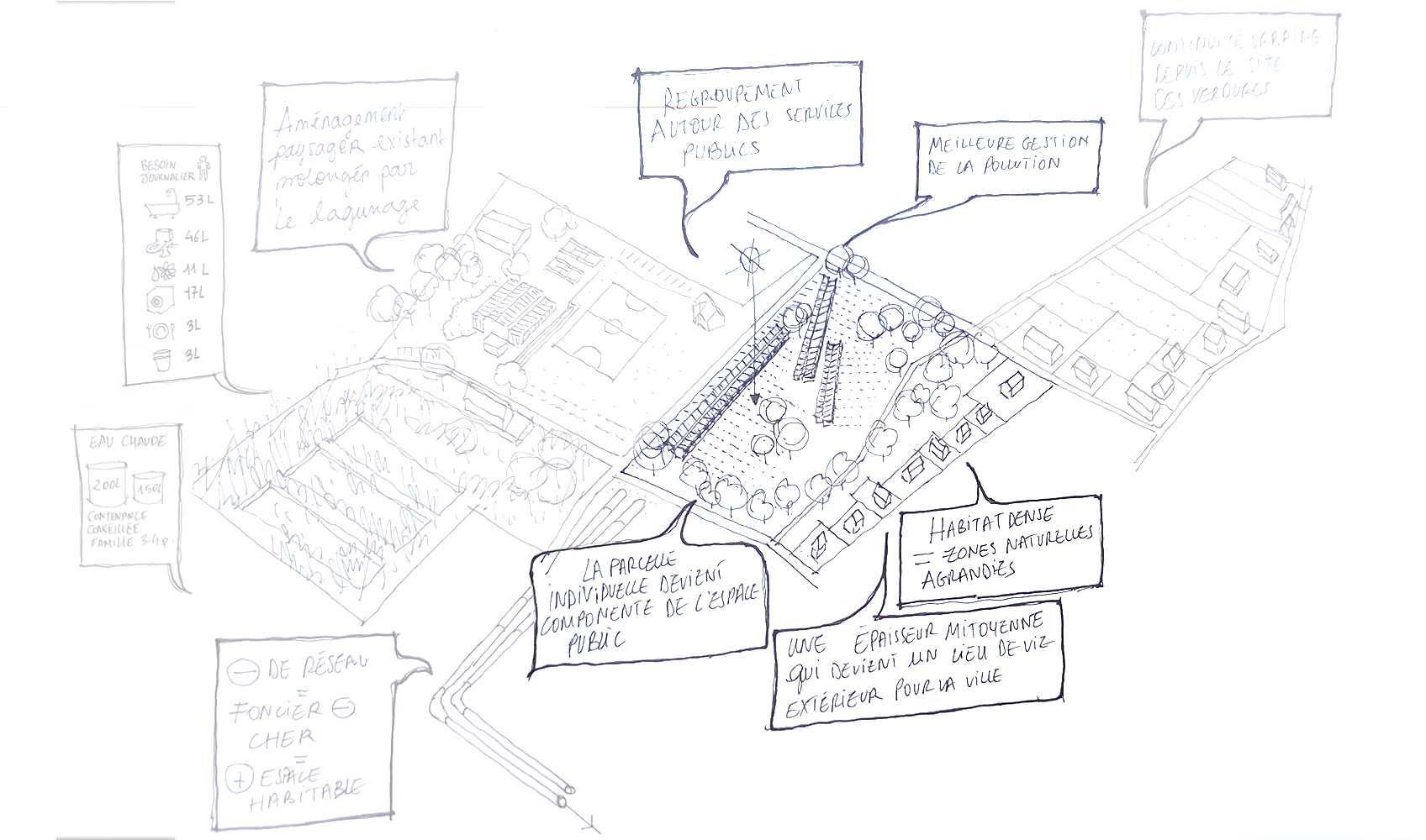 La mise en situation des réseaux d'energie constitue le cœur de la proposition d'implantation des logements. La densification du passage des reseaux influence directement l'orientation et la disposition des logements collectifs en bandes : connectés au réseau primaire d'energie de la co-génération, l'enfilade suit le chemin des reseaux. Ainsi chaque groupe de logement dispose d'une station d'échange ( échangeur), et d'un système de traitement des eaux communes. L'épaisseur des réseaux divise le logement en deux partie : le mur contient ainsi le reseau d'eau potable, l'assainissement, le chauffage et la redistribution des eaux grises. En plus d'un objectif de périnnité, les gains sont multiples : consommation d'eau réduite, chauffage réduit grâce à la cogénération et les apports passifs ( orientation et ventilation). La mise en œuvre constructive des réseaux est également simplifiée : les tranchées crées sont autant de talus sur lesquels viennent s'appuyer les différents logements qui se déroulent dans la pente du terrain. Les gains éspérés sur la facture énergétique et la densification des logements autours des réseaux seraient autant de gains sur le foncier : les parcelles offrent aux potentiels acheteurs ou locataires d'avantage de terrains en fond de parcelle, à l'image de l'organisation des « verdures ». Chaque terrain profite des décalages de la pente pour se diviser, cependant là encore certains usages peuvent être communs : gestion du bio-gaz par le compost, chemin d'accès, fond de jardin partagés qui deviennent du même coup des composants de l'espaces public. L'impact sur le paysage serait également moindre et d'avantage pensé en amont : la ZAC s'inscrit dans la continuité et en connection directe avec le parc sportif dont elle partage le réseau de chauffage. On peut également imaginer cette inter-dépendance comme constitutive de d'avantage de lien social : « mon voisin nage dans une piscine dont l'eau est chauffée par le même réseau qui chauffe l'eau de mon évier ». Là encore, des solutions de regroupement économique peuvent se mettre en place entre la gestion de la piscine municipale, et la mise à disposition du foncier pour la ZAC.
