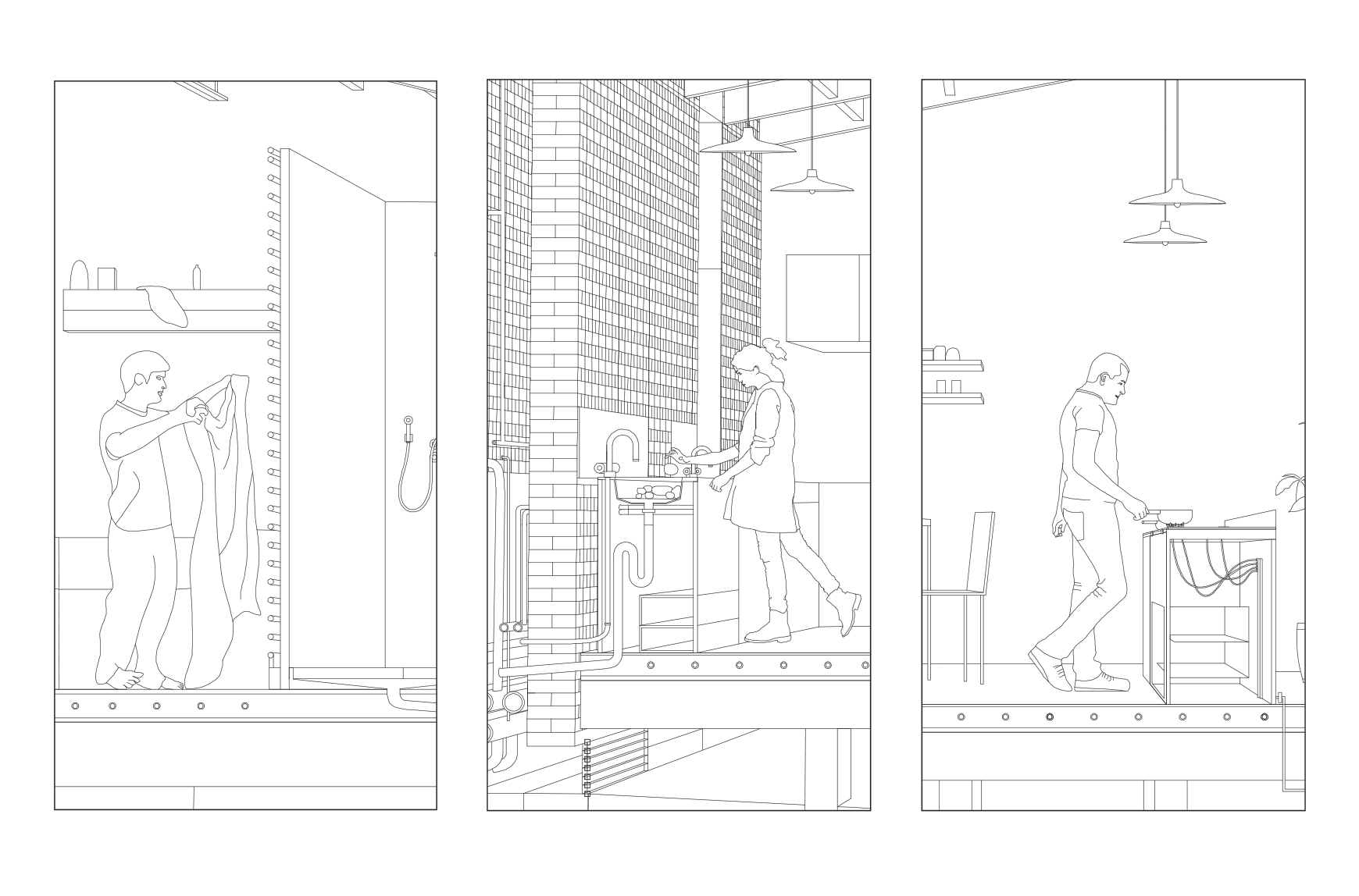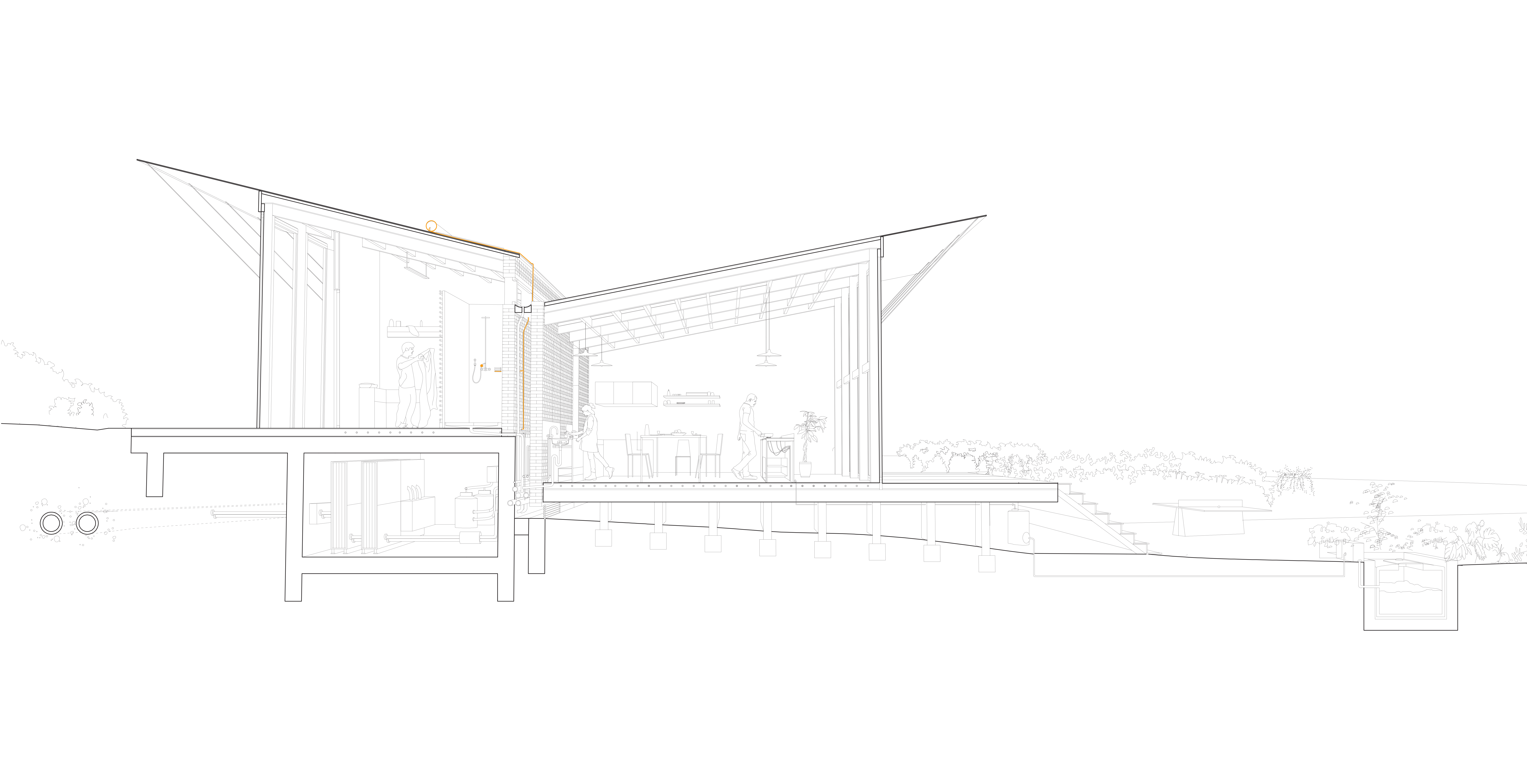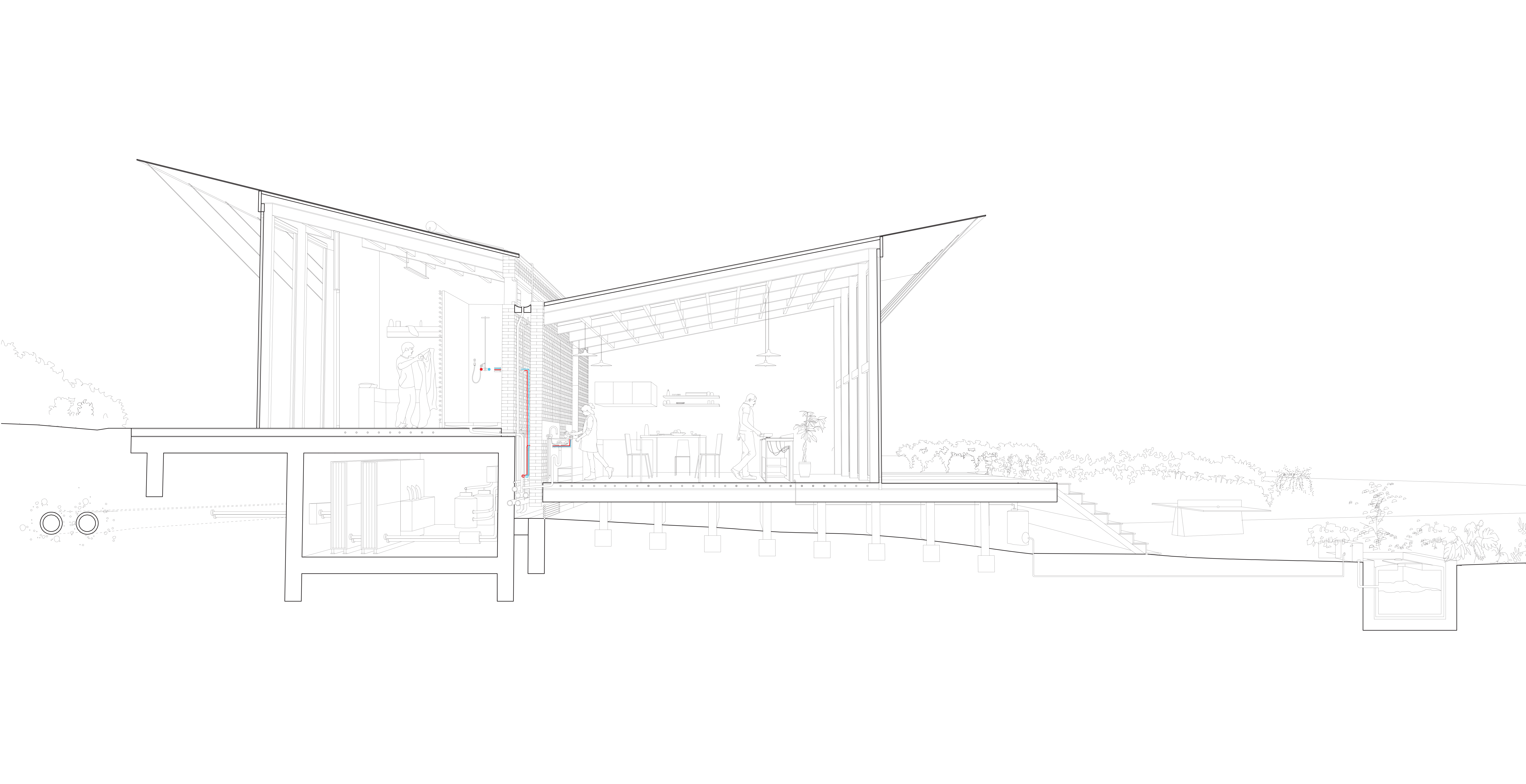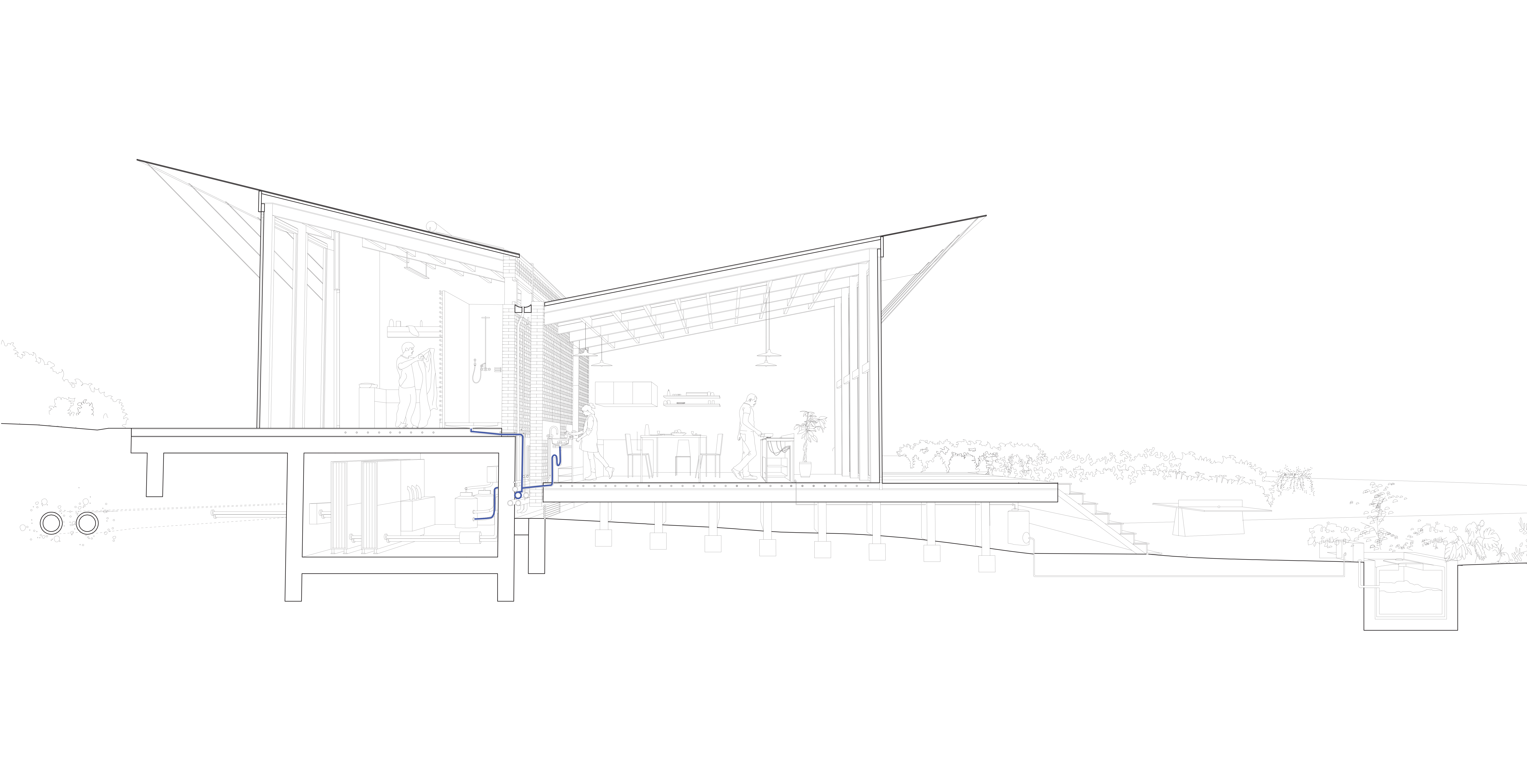 La mise en situation des réseaux d'energie constitue le cœur de la proposition d'implantation des logements. La densification du passage des reseaux influence directement l'orientation et la disposition des logements collectifs en bandes : connectés au réseau primaire d'energie de la co-génération, l'enfilade suit le chemin des reseaux. Ainsi chaque groupe de logement dispose d'une station d'échange ( échangeur), et d'un système de traitement des eaux communes. L'épaisseur des réseaux divise le logement en deux partie : le mur contient ainsi le reseau d'eau potable, l'assainissement, le chauffage et la redistribution des eaux grises. En plus d'un objectif de périnnité, les gains sont multiples : consommation d'eau réduite, chauffage réduit grâce à la cogénération et les apports passifs ( orientation et ventilation). La mise en œuvre constructive des réseaux est également simplifiée : les tranchées crées sont autant de talus sur lesquels viennent s'appuyer les différents logements qui se déroulent dans la pente du terrain. Les gains éspérés sur la facture énergétique et la densification des logements autours des réseaux seraient autant de gains sur le foncier : les parcelles offrent aux potentiels acheteurs ou locataires d'avantage de terrains en fond de parcelle, à l'image de l'organisation des « verdures ». Chaque terrain profite des décalages de la pente pour se diviser, cependant là encore certains usages peuvent être communs : gestion du bio-gaz par le compost, chemin d'accès, fond de jardin partagés qui deviennent du même coup des composants de l'espaces public. L'impact sur le paysage serait également moindre et d'avantage pensé en amont : la ZAC s'inscrit dans la continuité et en connection directe avec le parc sportif dont elle partage le réseau de chauffage. On peut également imaginer cette inter-dépendance comme constitutive de d'avantage de lien social : « mon voisin nage dans une piscine dont l'eau est chauffée par le même réseau qui chauffe l'eau de mon évier ». Là encore, des solutions de regroupement économique peuvent se mettre en place entre la gestion de la piscine municipale, et la mise à disposition du foncier pour la ZAC.