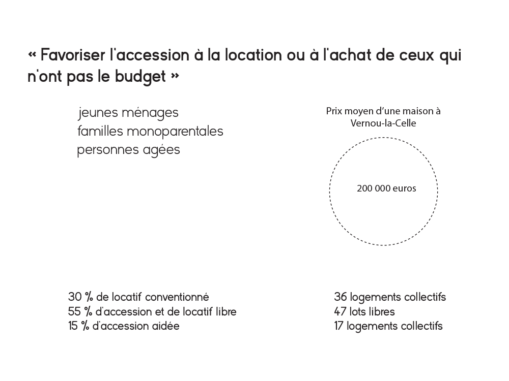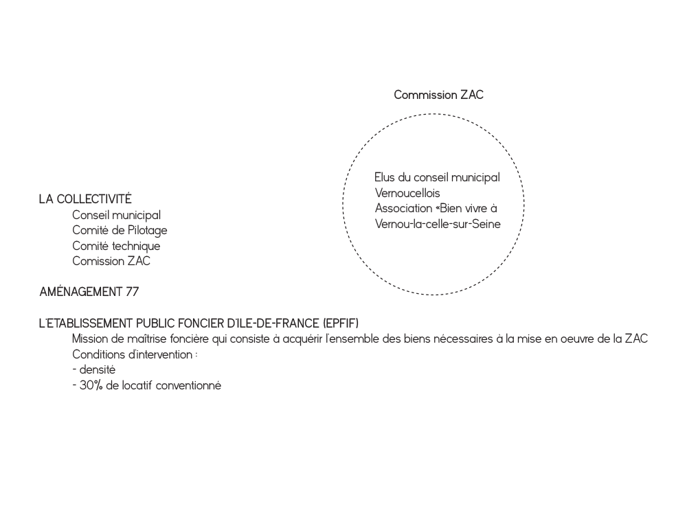 La ZAC des colinettes est gérée par trois acteurs différents : Aménagement 77 qui a mission d’aménager la ZAC, faisant appel à une agence d’urbanisme et de paysage, la collectivité qui comprend la municipalité et les Vernoucellois, et l’établissement public foncier d’Île-de-France, chargé de la maîtrise foncière. La volonté de la commission ZAC est de faire venir davantage de familles jeunes et monoparentales, dans une ville où la moyenne d’âge est plutôt élevée, avec une majorité de logement collectif. Notre positionnement « architectural » serait donc de reconsidérer l’implantation de la ZAC, au regard du travail d’analyse précédent : comment reprendre un système local ( les verdures) pour imaginer une autre division parcellaire ? Comment développer un mode d’assainissement, collectif ou individuel moins lourd sur le plan environnemental ? Quelles en seraient les conséquences en terme paysagères et architecturales? Comment pourrait-on rationaliser la question des réseaux, et repenser ainsi l’implantation des logements collectifs, de la micro-maison ? Peut-on imaginer des gains financiers sur le foncier qui pourrait être reversé ailleurs dans la chaîne de financement ?