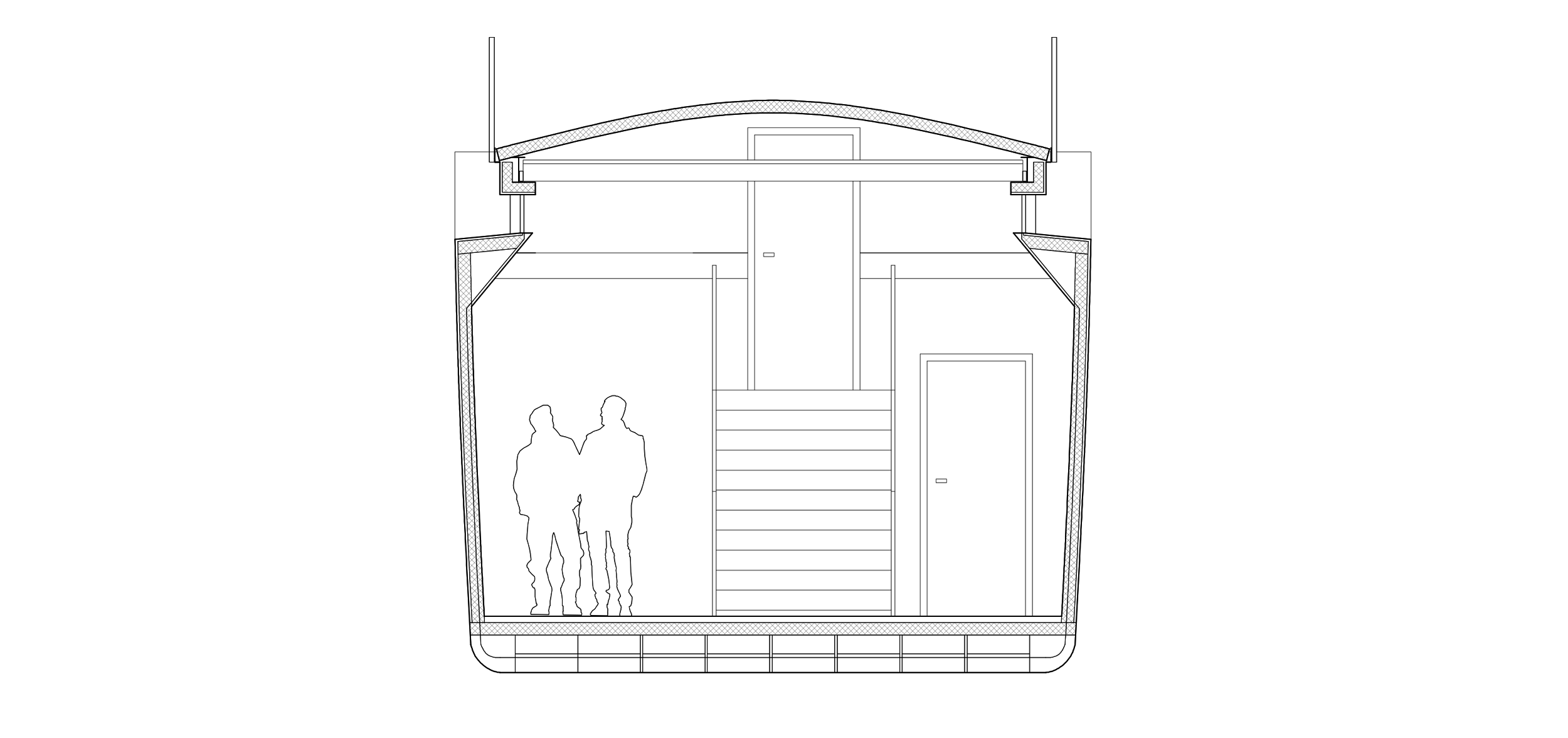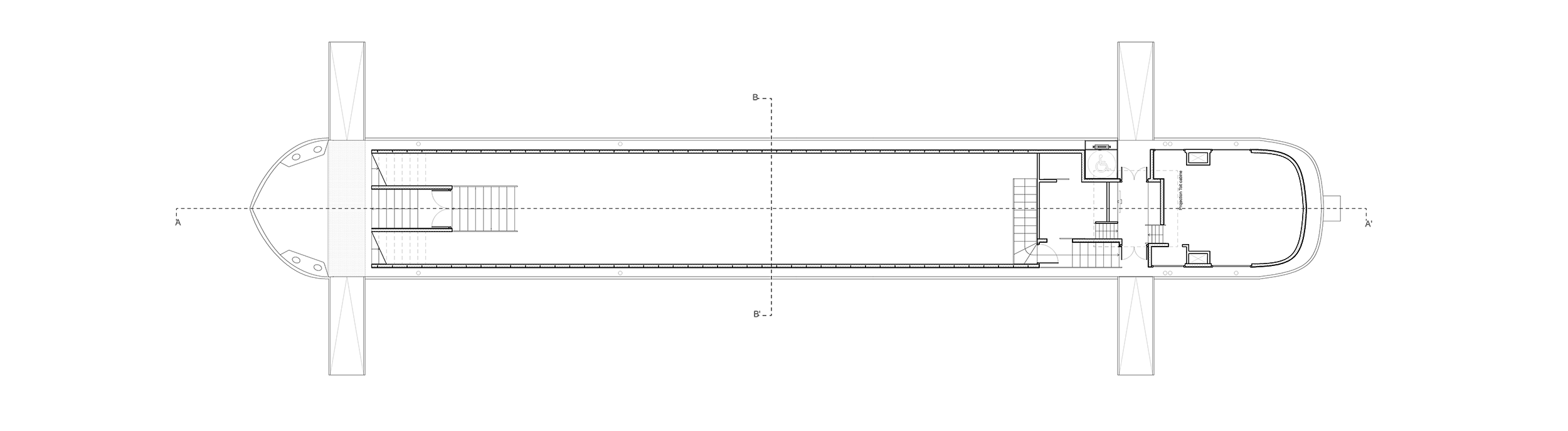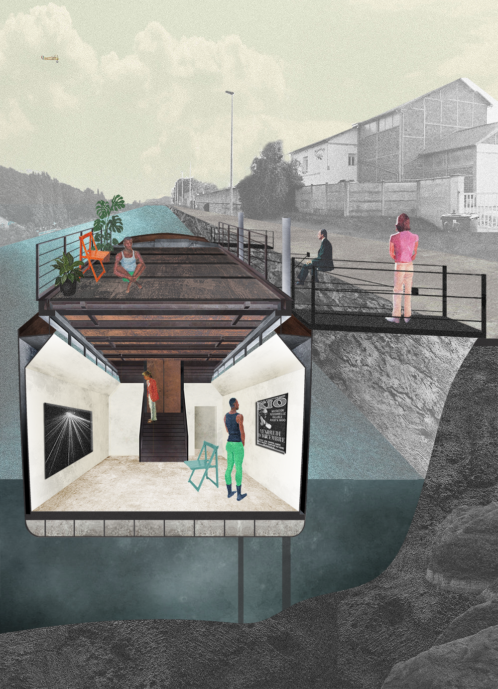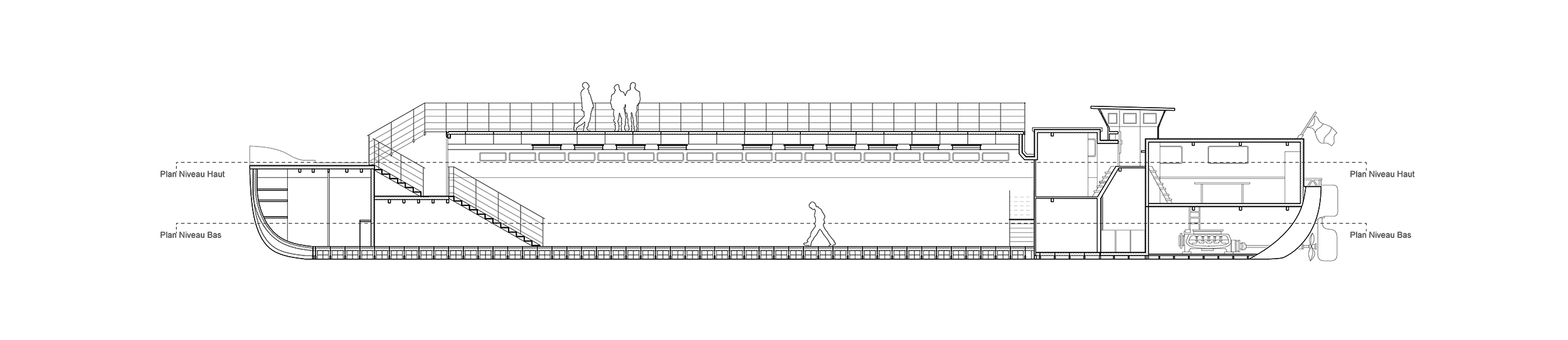 Suite à l’acquisition de la péniche, sa réhabilitation est nécessaire. Il s’agit dans un premier temps de la mettre aux normes ERP-EF (établissement flottant recevant du public) et PMR (Réglementation accessibilité handicap). La cale doit ensuite être réaménagée afin de proposer un espace libre pouvant accueillir expositions, projections et représentations. Le pont est rendu praticable pour des événements en extérieur ainsi que pour faciliter son accroche aux différents points d’amarrage.