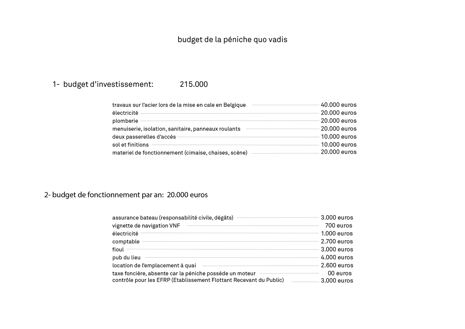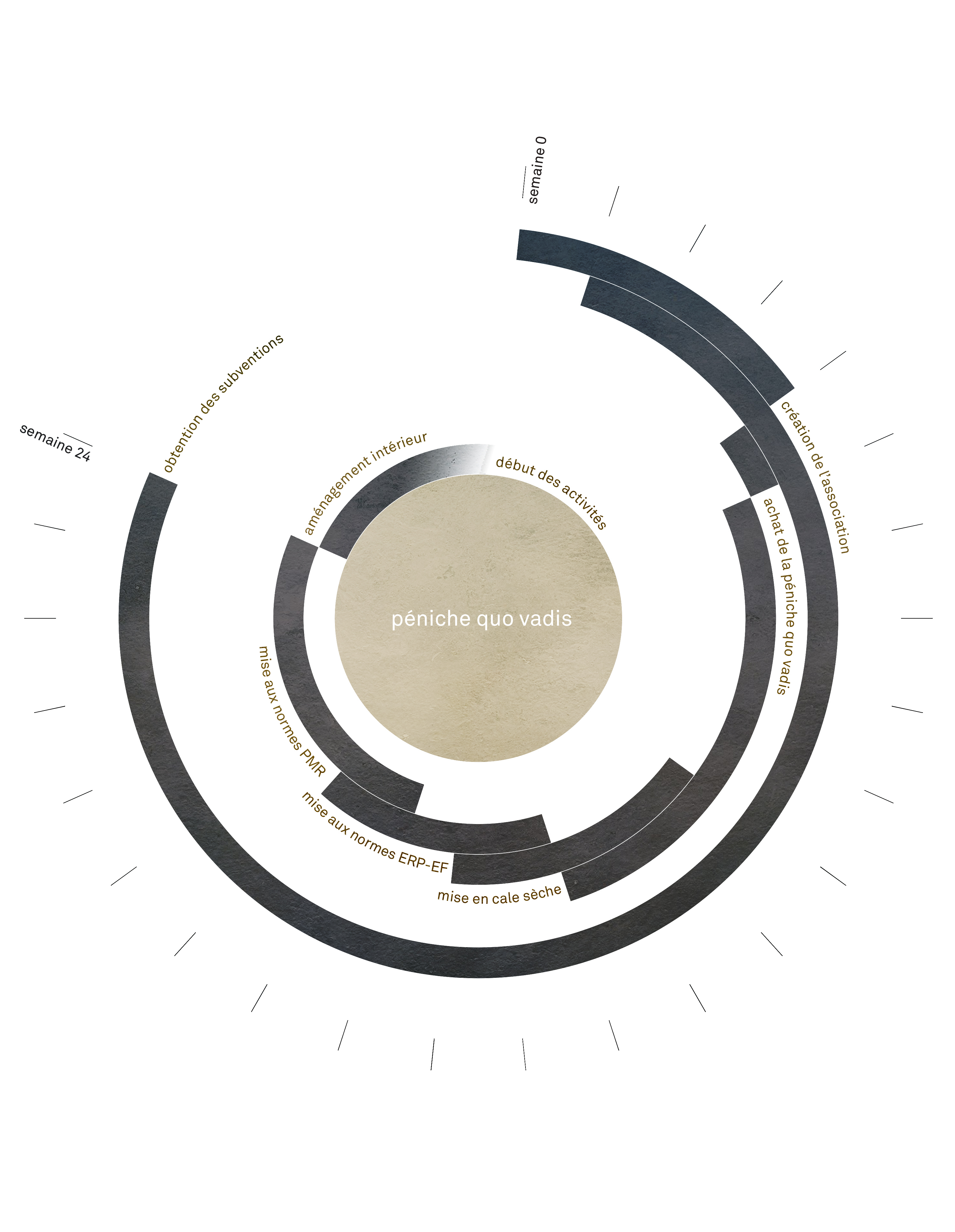 La péniche Quo Vadis est le projet initiateur de l’expérience. Elle sert de première impulsion à un mouvement participatif local. Naviguant sur la Seine et le Loing, elle est actuellement en vente à hauteur de 75 000 €, elle présente un atout financier rapidement accessible. Son caractère itinérant permet la visibilité d’un patrimoine culturel local à une échelle territoriale. Le projet naît de la création d’un groupement d’associations artistiques du département déjà existantes et investies dans la valorisation de l’offre culturelle Seine-et-Marnaise. Ce groupement acquiert la légitimité de faire appel à des subventions européennes (Fonds Européens de Développement Economique et Régional), régionales (auprès de la Direction Régionale des Affaires Culturelles) et départementales (subventions aux acteurs culturels et patrimoniaux). De plus, un système de mécénat est possible en contre-partie d’une mise à disposition du lieu pour les événements privés des entreprises engagées, ainsi qu’une communication à leur propos.